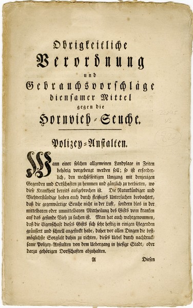 Obrigkeitliche Verordnung und Gebrauchsvorschläge dienstamer Mittel gegen die Hornvieh-Seuche Polizey-Anstalten – “Official Regulations and Recommendations for the Use of Effective Remedies Against the Cattle Plague” issued by the administrative authority in Frankfurt – including antisemitic regulations prohibiting the entry of Jews, described as “disease carriers” into the cattle fields of Frankfurt and its surroundings. Frankfurt am Main, 1777. In German.