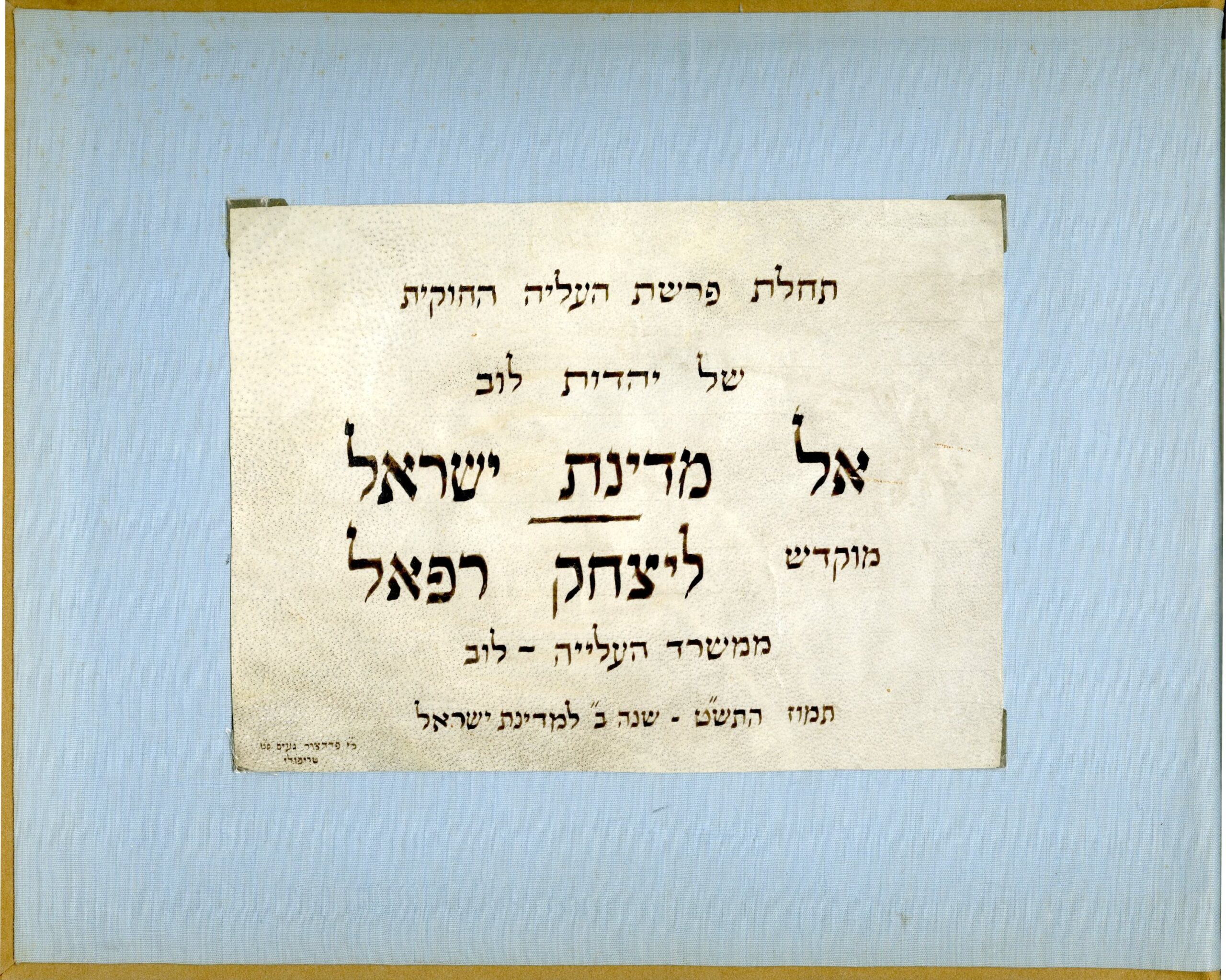 A historical photo album documenting the immigration of Libyan Jewry to the Land of Israel. Specially prepared by representatives of the Aliyah Office in Libya and dedicated to Yitzhak Rafael – a member of the Executive of the Jewish Agency and Head of the Aliyah Department, a position he held until 1953. Tammuz 5709 [1949] – Year II of the State of Israel. Rare.