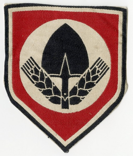 In the center, a black spade (Spaten) – a symbol of physical labor, and wheat stalks – a symbol of agricultural work and farming. Set against a round white background with a red shield-shaped border – colors associated with Third Reich propaganda. The emblem was used by members of the organization (mostly men, but also women’s divisions).
