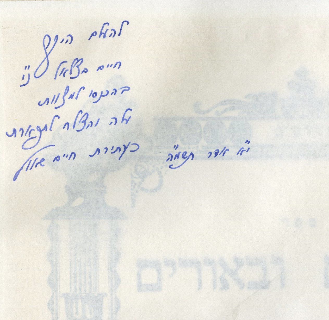 ‘Dear young Haim Bezalel NI In his entry into the Mitzvot, rose to glory in the life and succeeded at the request of Haim Saul, eyar 11th 1985’.