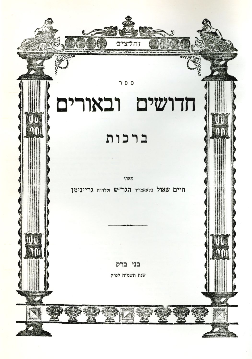 Chidushim Ubiurim on the tractate of brachot, Bnei Brak, 1985. On the protective page, a dedication by the author, the genius Rabbi Chaim Shaul Greiniman.