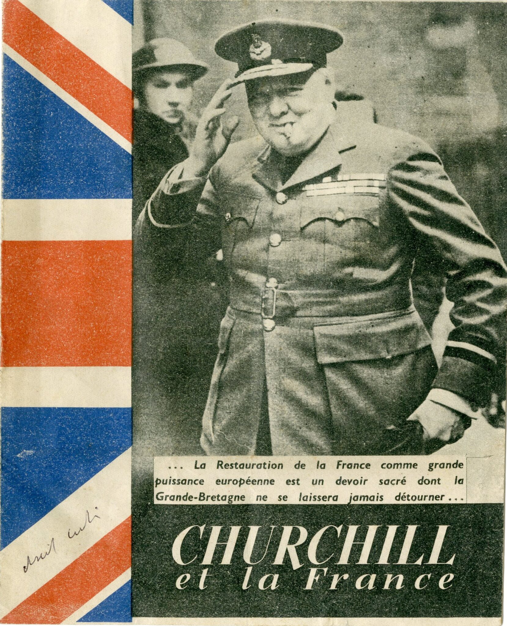 Throughout the booklet are numerous photographs of Churchill at various events in support of France, from 1938 through the end of the war, accompanied by quotes from speeches he gave about the unbreakable alliance between Britain and France. For example, in 1939: “I can assure you that, as things stand, we need help from France no less than the French need help from Great Britain. For several years, I have felt that the main hope for freedom and security lies in the close union of British and French democracy.” In 1940: “For my part, I have unshakable confidence in the French army. Whether it is every officer or soldier, every brigade or division that seizes the enemy by the throat wherever he meets him, he will contribute unmistakably to the final outcome.” The booklet also highlights Churchill’s worldview that the Vichy regime was, in fact, forced upon France. In 1941, he said: “And everywhere, in occupied France and in unoccupied France (for their fate is the same), these honest people, this great people, the French nation, are rising again. Hope is reawakening in the heart of this warrior race, even disarmed…”. The booklet is filled with countless photographs of Churchill during his visits to France and at events held in support of France throughout the war years.