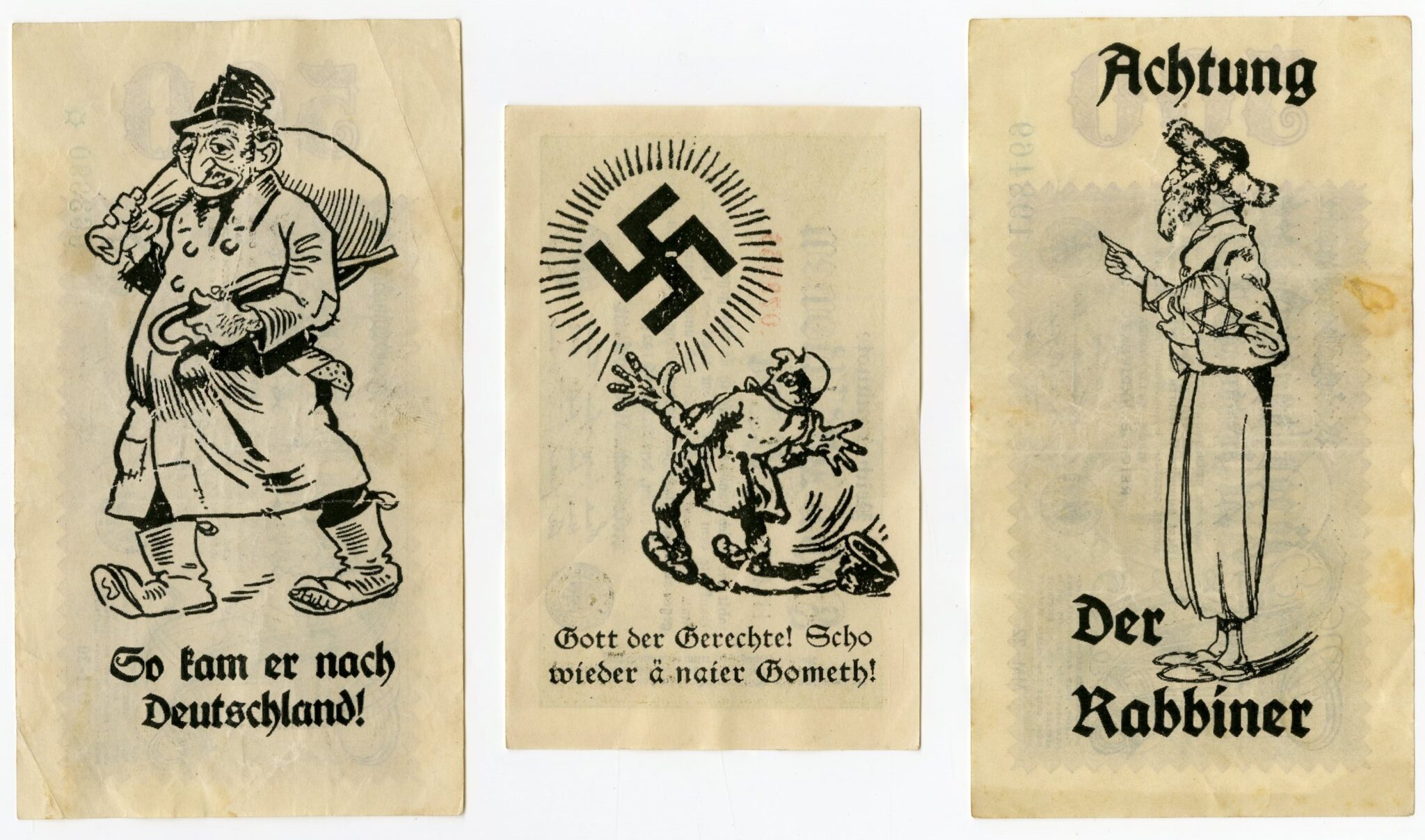 Among the notes: a frightened Jew confronted by a swastika, with a caption in German written in a mock Eastern European Yiddish accent (this caricature was printed on German banknotes in the 1920s in several slightly different versions); “The Jew took our gold and silver and left us with this filth, ” “United Germany, vote Adolf Hitler, ” “The Jewish Bank, ” “Danger – the rabbi, ” and a Jew in tattered clothes with the caption: “This is how he arrived in Germany” (a rare version featuring a Star of David near the serial number of the note).