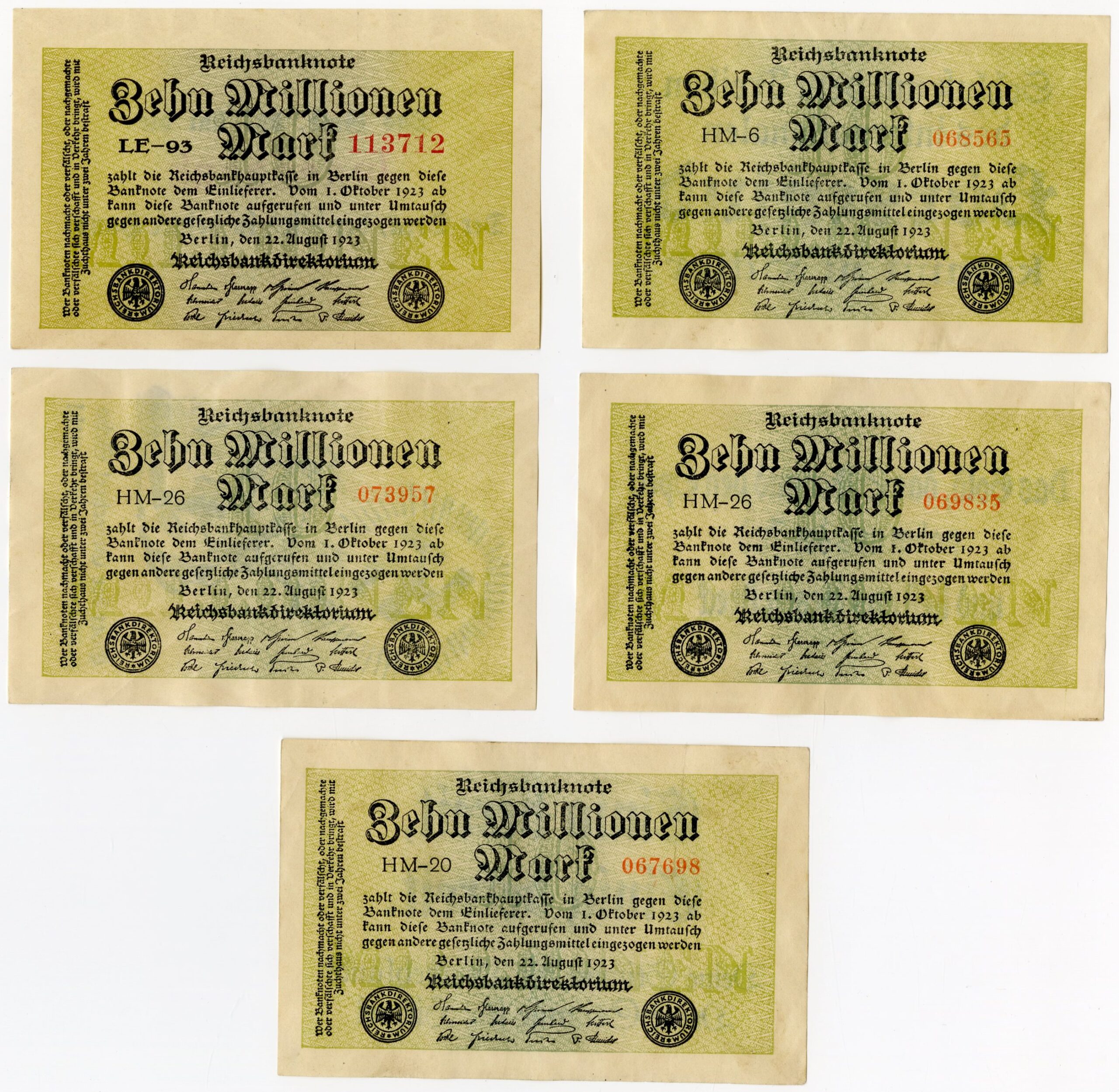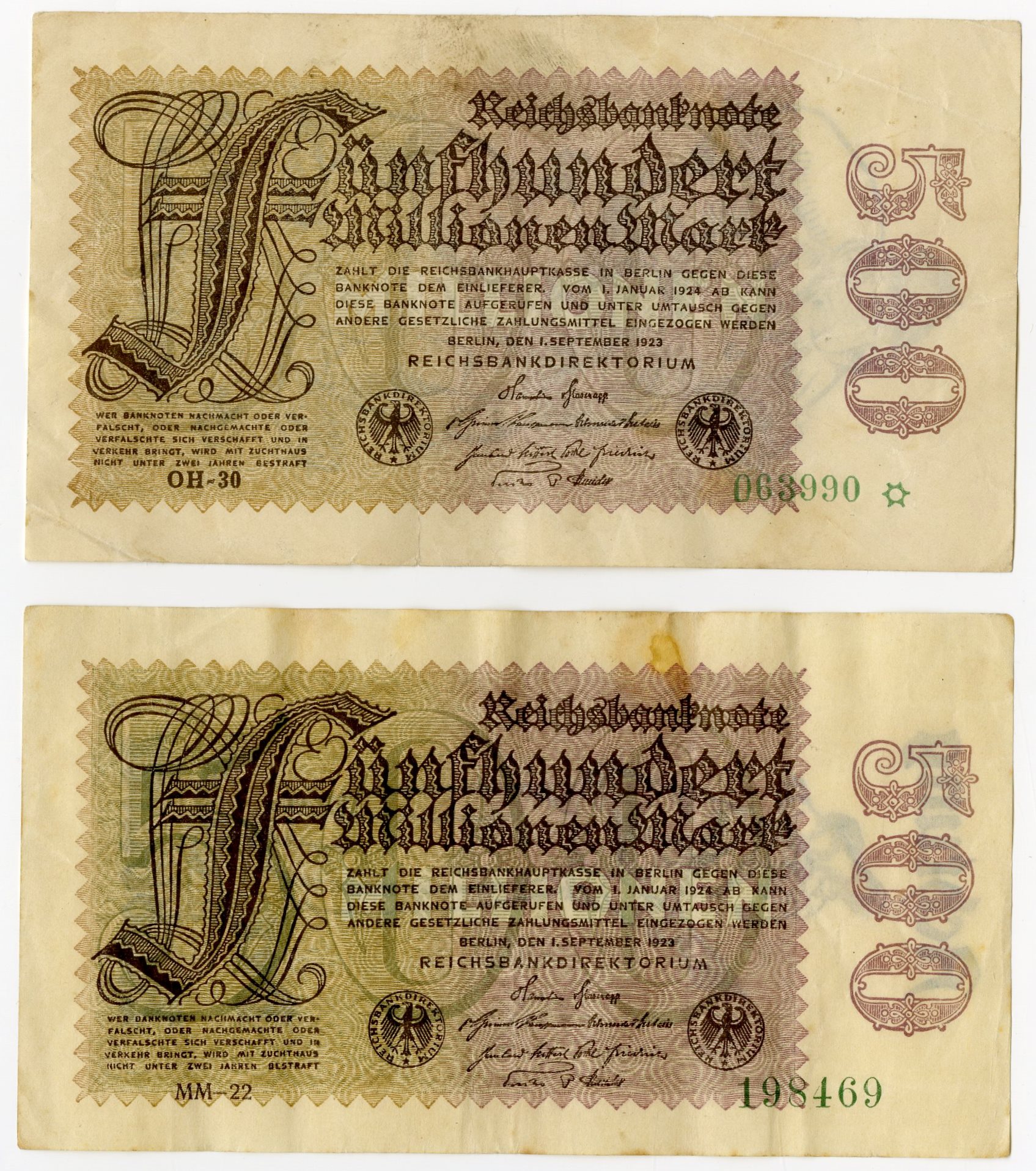 Seven antisemitic German Mark banknotes. Germany, 1920s and early 1930s. Banknotes deliberately printed for antisemitic purposes. On the front of each note appears a stereotypical Jewish figure along with antisemitic text. Five of the notes bear the astronomical denomination of Ten Million German Marks, and two of them are in the denomination of 500 German Marks.