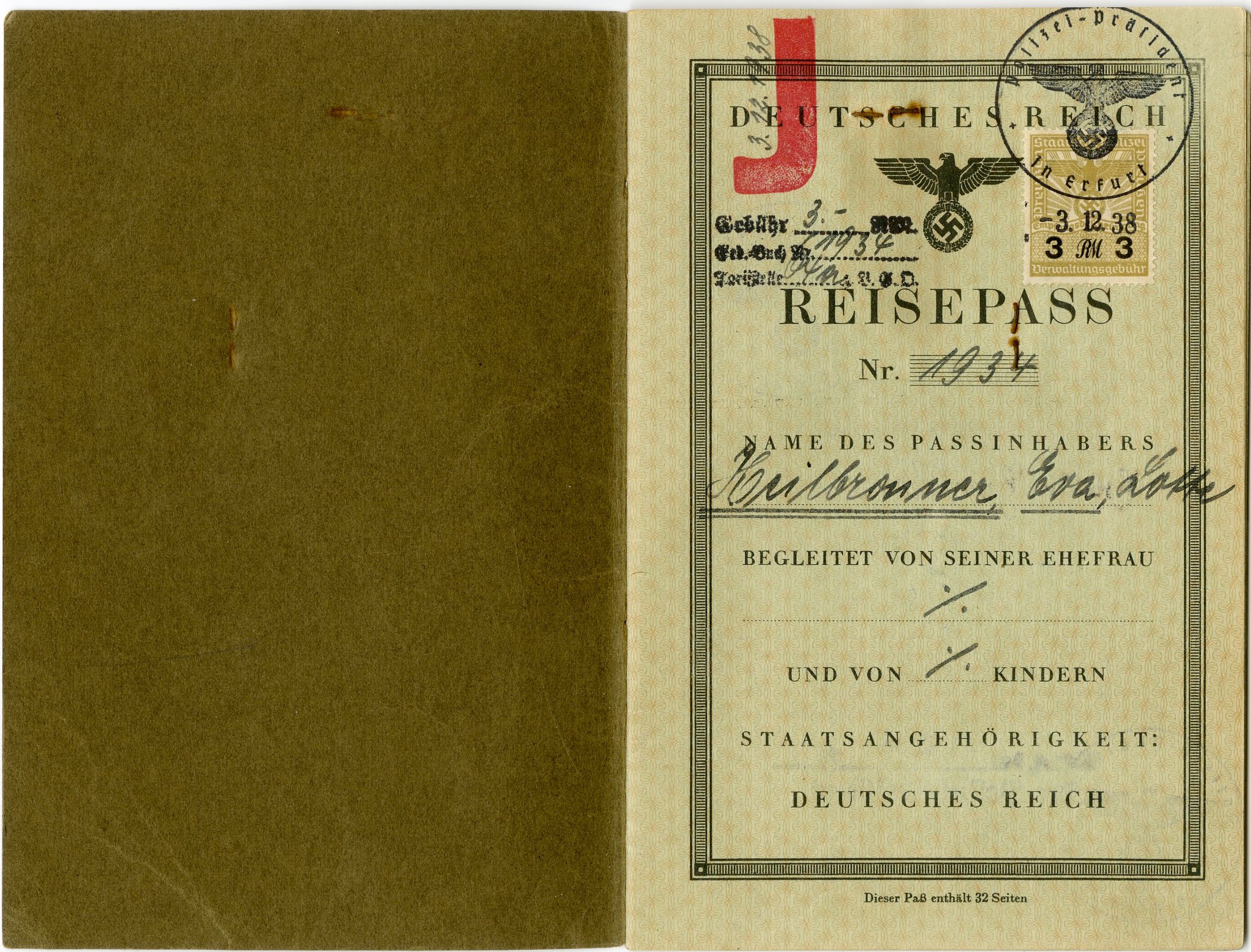 German “J” passport under Nazi occupation, belonging to a Jewish girl named Eva Lotte Heilbronner, who left Germany together with her mother (See next item) shortly after Kristallnacht, on December 6, 1938, and immigrated to Eretz Israel at the age of 8.