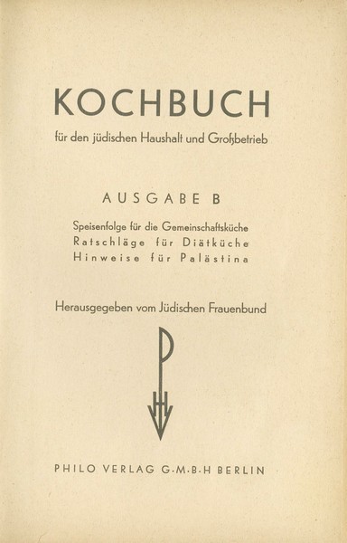 Kochbuch für den jüdischen Haushalt und Großbetrieb – “Cookbook for Jewish Households and Large-Scale Kitchens” – “Meal Orders for the Communal Kitchen, Tips for Nutritional Cooking, and Information for Palestine”, published by the Jüdischer Frauenbund – the Jewish Women’s Association, edited by Mrs. Guni Katzenstein of Düsseldorf. Published by Philo Verlag G.m.b.H. on behalf of the Jüdischer Frauenbund. Berlin, [1937] – second edition. In German.