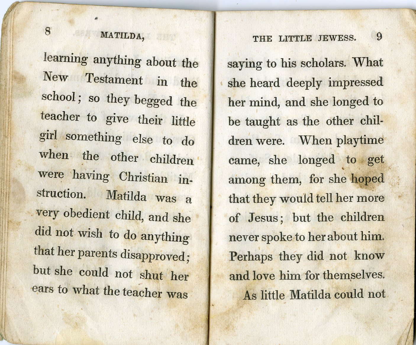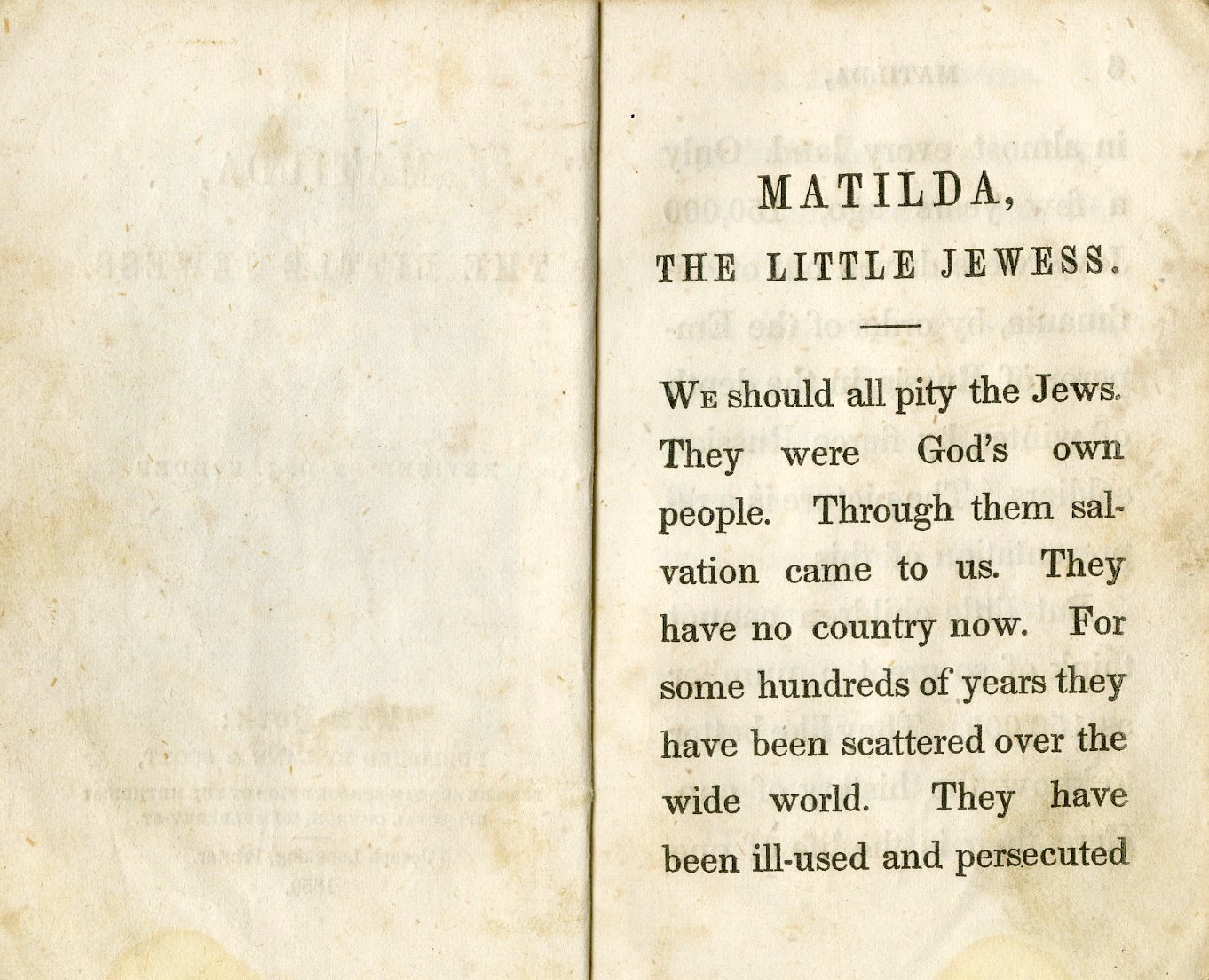 Matilda the Little Jewess. Revised by D. P. Kidder – Antisemitic pocket-sized children’s booklet. Published by Lane & Scott for the Sunday-School Union of the Methodist Episcopal Church. A sorrowful tale of a young Jewish girl, presented as a model for the sufferings of the Jewish people. At the opening: a woodcut illustration depicting “Jews being expelled from Lithuania.” New York, 1850 – first edition. Rare.