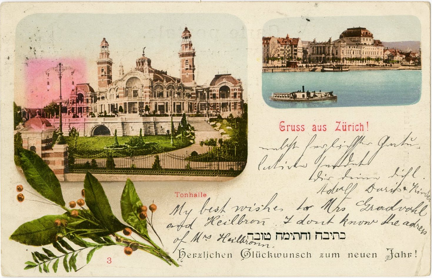 Gruss aus Zurich New Year postcard – greetings from Zurich – featuring an image of the city’s concert hall and the shore of Lake Zurich, with a New Year’s greeting in Hebrew and German – postmarked 1906.