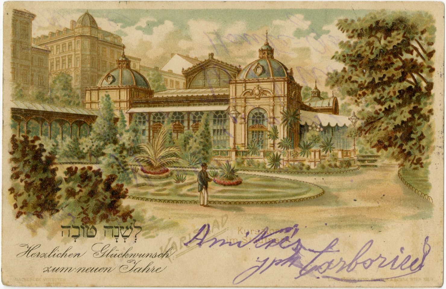Postcard with “L’Shanah Tovah” in Hebrew and German – Carlsbad – featuring an image of the city park. Postmarked 1906.