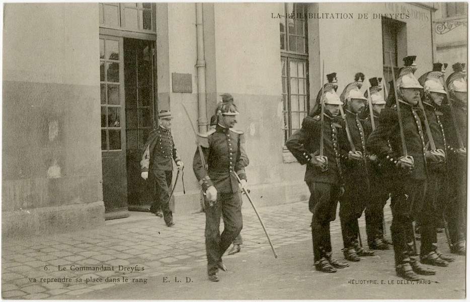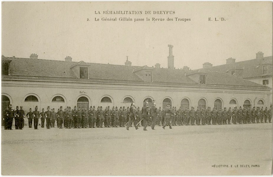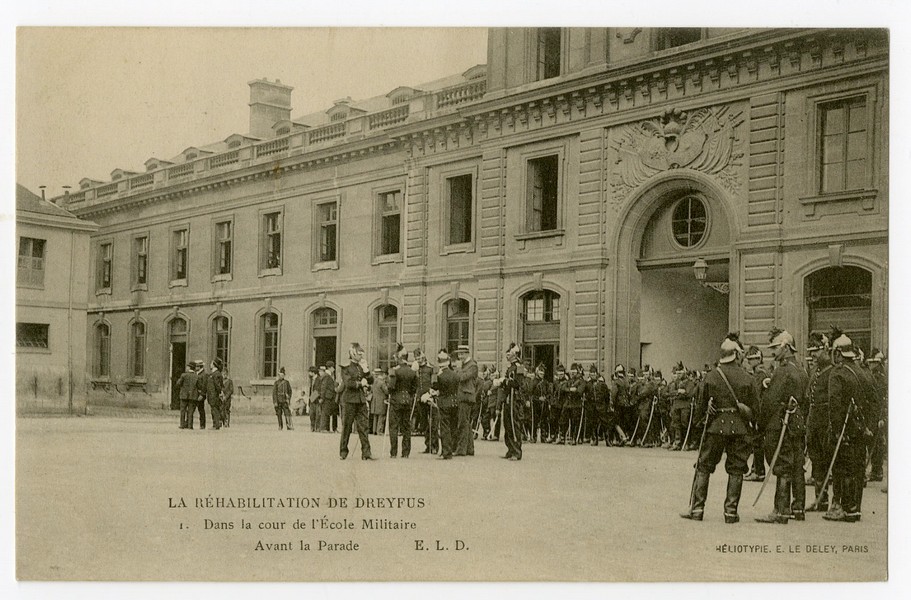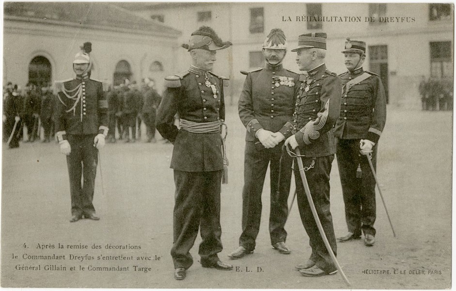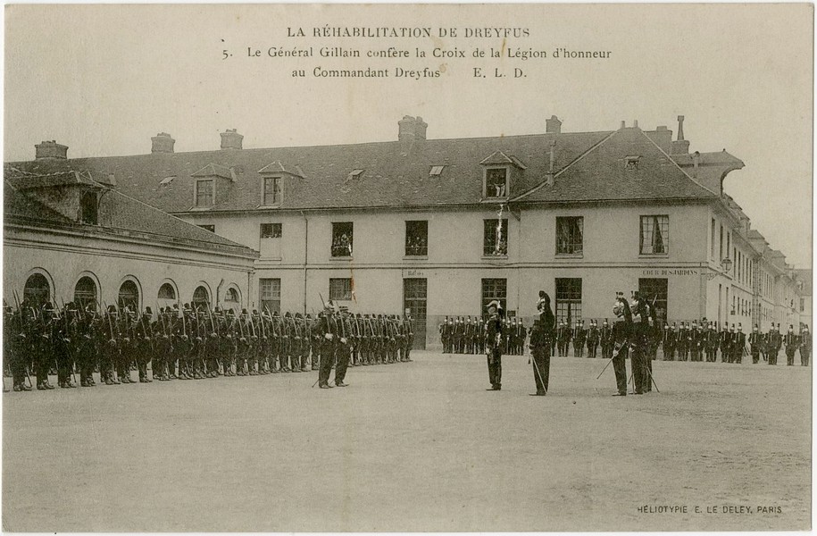 Postcards: A rare close-up photograph of Dreyfus speaking with Georges Clemenceau (Clemenceau was one of the leading supporters of Dreyfus throughout the affair, and played a key role in bringing justice. He was not only a politician but also a vigorous journalist who worked actively for Dreyfus’s exoneration through his newspaper L’Aurore, which published Zola’s famous article “J’accuse!”), Dreyfus exiting the building to take his place at the center of the ceremony, The honor parade during the ceremony, Following the decoration, Dreyfus speaking with General Gillain and Commander Targe, The honor formation from various photographic angles.