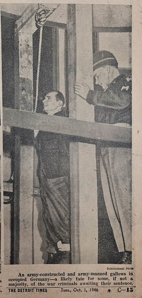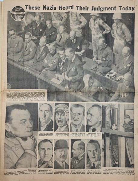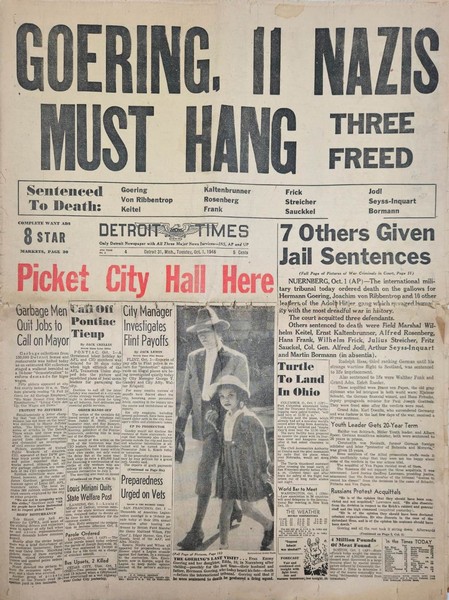 Detroit Times newspaper sheet (a daily American newspaper published in Detroit, Michigan) from October 1, 1946, reporting on the sentencing of the Nazi war criminals at the Nuremberg Trials, which was delivered that same day. Headline: GOERING, 11 NAZIS MUST HANG – Göring and 11 other Nazis to be hanged. Subheadline: “7 Others Given Jail Sentences” – Seven others sentenced to imprisonment.