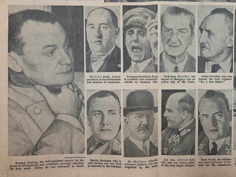 Nuremberg, October 1 (AP) – The International Military Tribunal today ordered the death by hanging of Hermann Göring, Joachim von Ribbentrop, and 10 other leaders of Adolf Hitler’s gang, who brought harm to humanity in the most terrible war in history and were sentenced to death – Field Marshal Wilhelm Keitel, Ernst Kaltenbrunner, Alfred Rosenberg, Hans Frank, Wilhelm Frick, Julius Streicher, Fritz Sauckel, Colonel General Alfred Jodl, Arthur Seyss-Inquart, and Martin Bormann (in absentia). The court acquitted three other defendants.