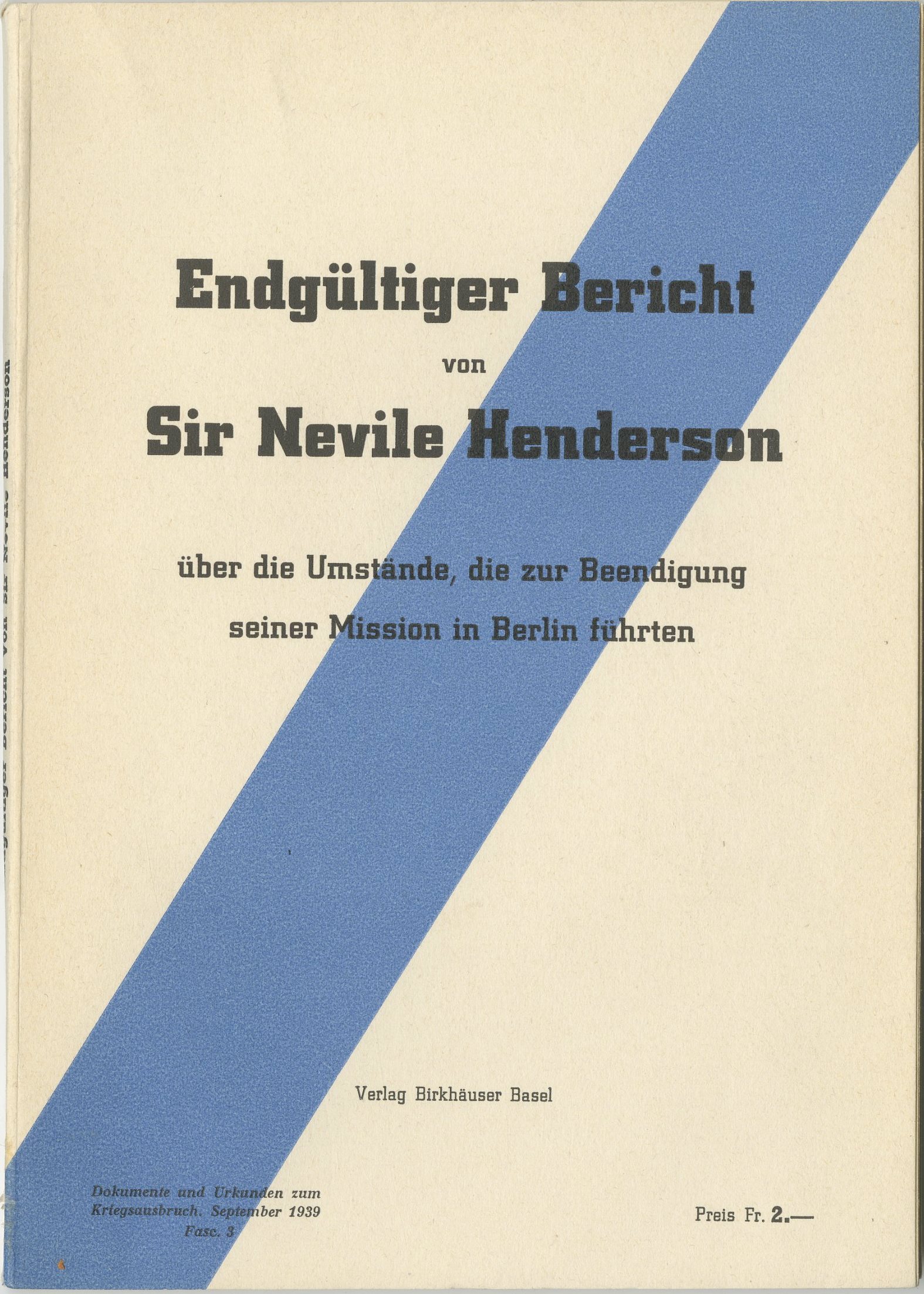 Endgültiger Bericht von Sir Nevile Henderson über die Umstände, die zur Beendigung seiner Mission in Berlin führten – The Final Report of British Diplomat Sir Neville Henderson on the Circumstances Leading to the End of His Mission in Berlin – Accompanied by historical documents and records serving as compelling evidence of Nazi Germany’s clear intent to start a war. September 1939 – First German edition. Published by Birkhäuser Basel, Basel. Rare.