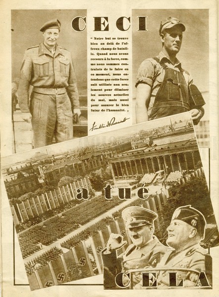 The front and back covers feature an especially striking design by Jaque Richez: the goddess of victory, Victoria, raises her sword over a Nazi swastika shattered into fragments, flanked by the flags of the Allied powers.
