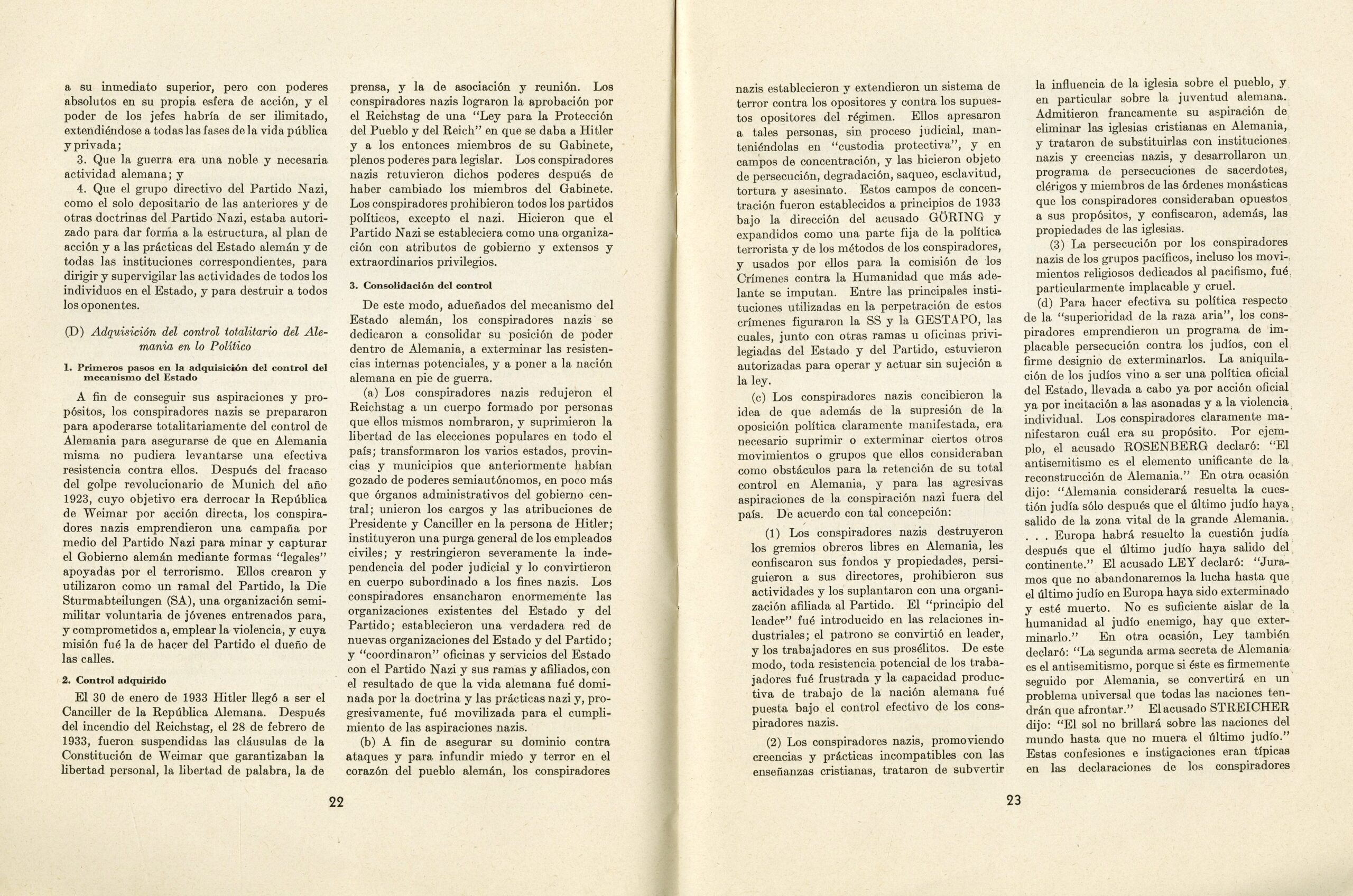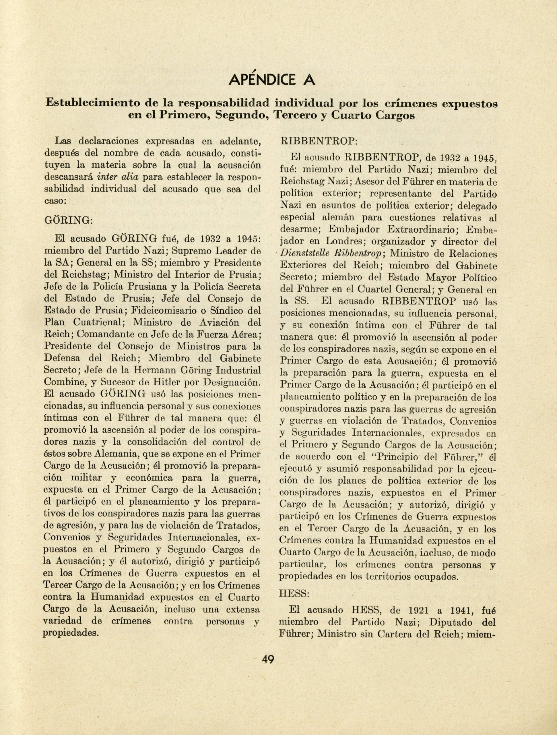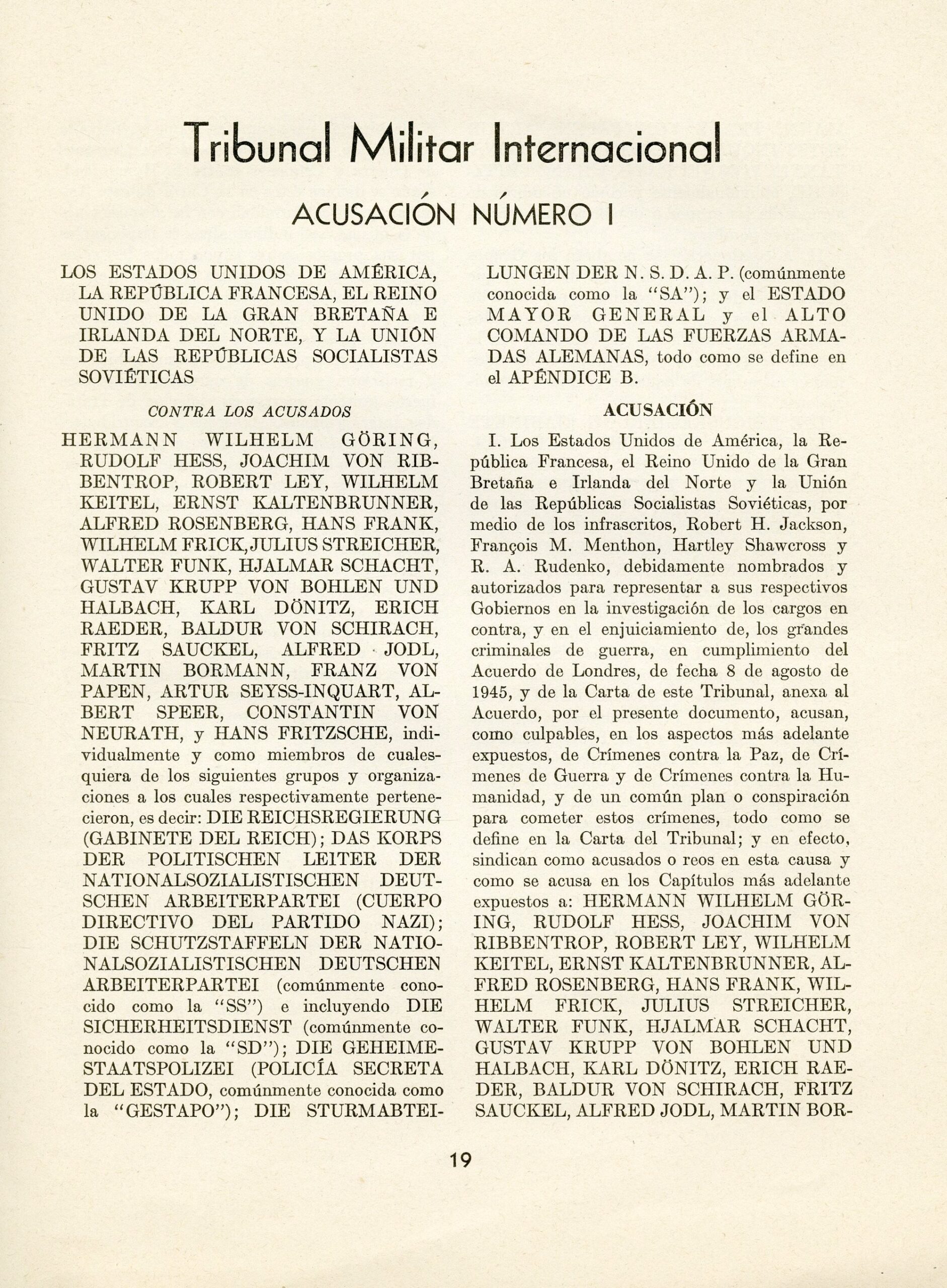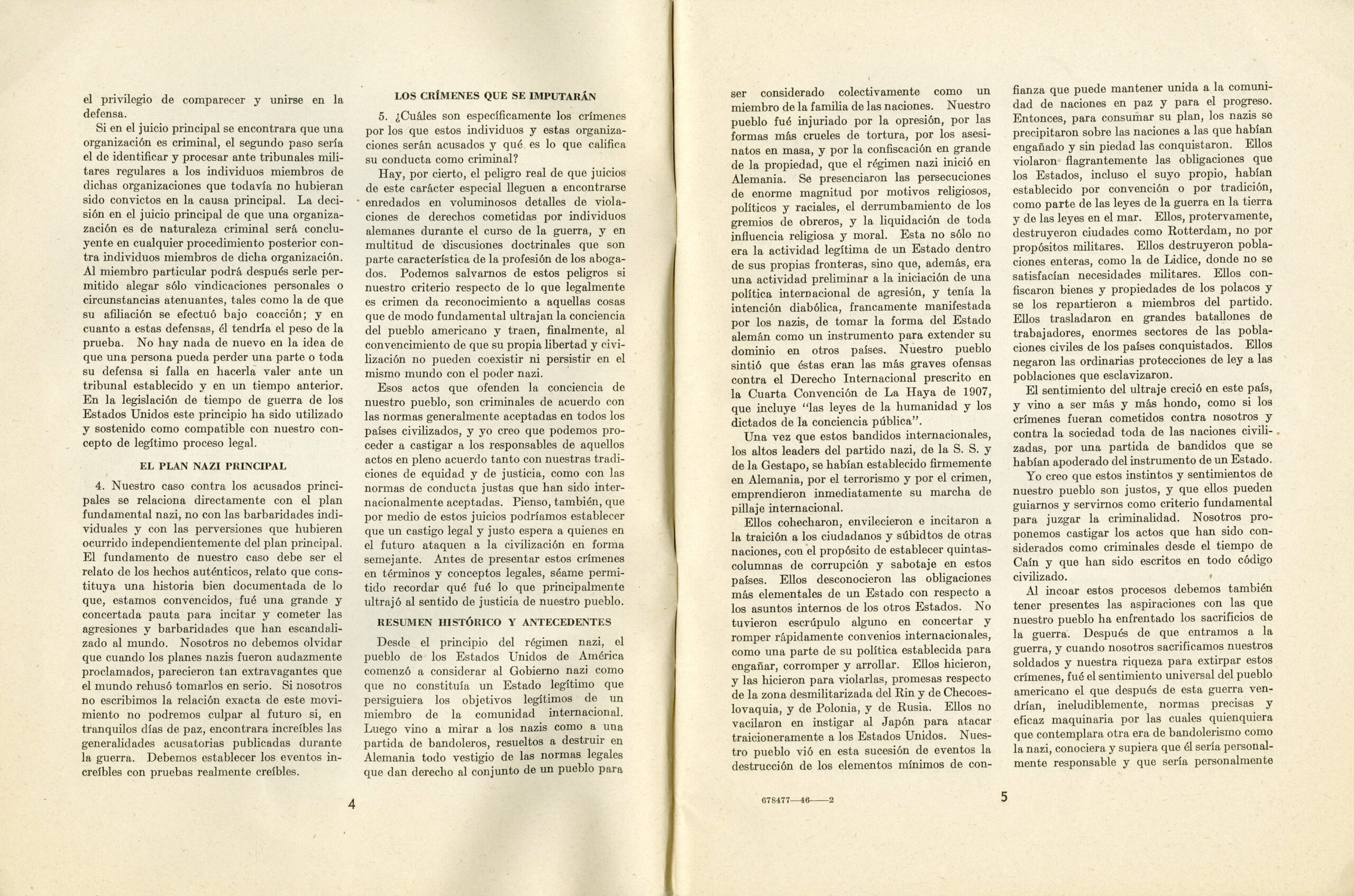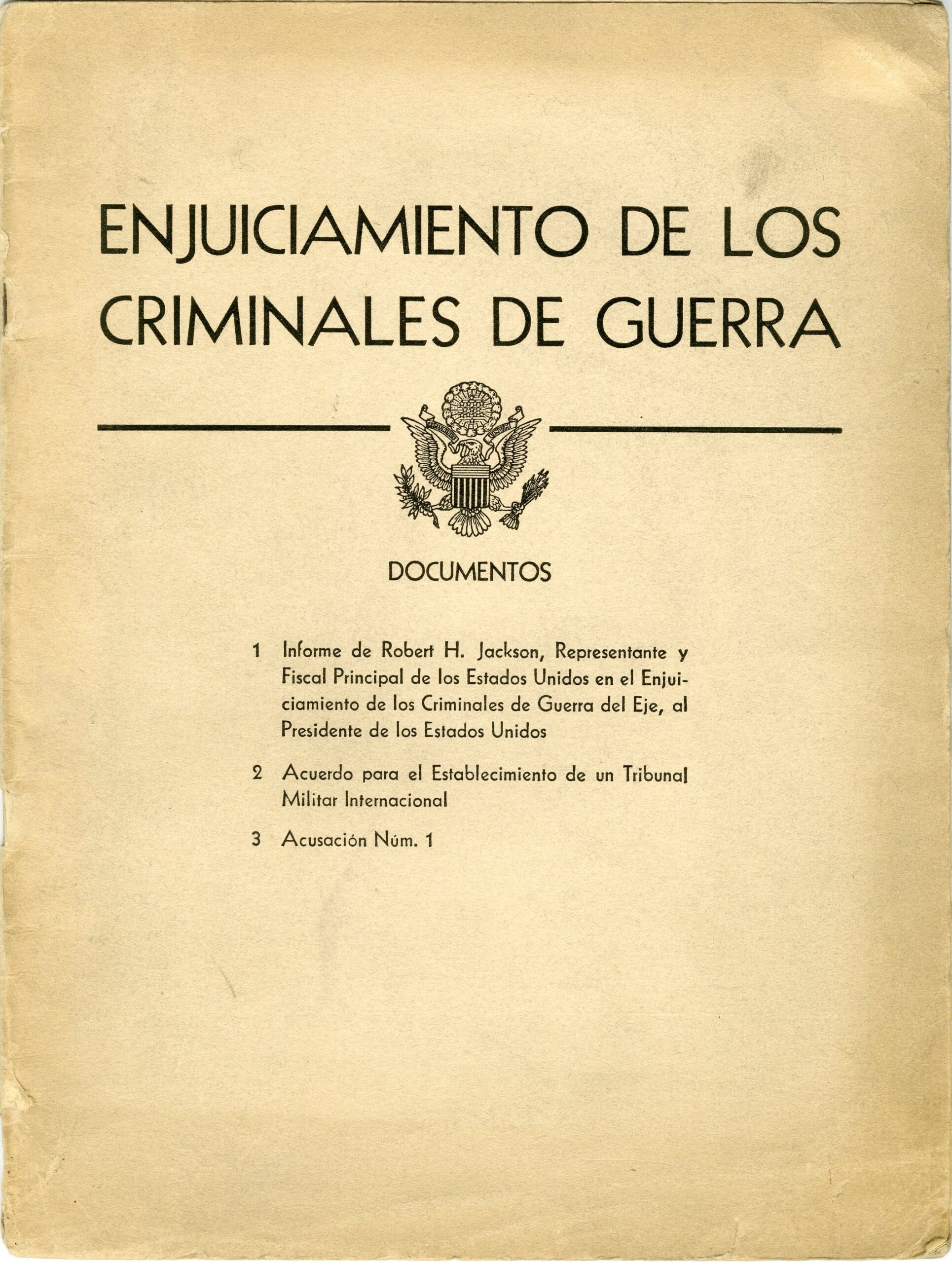 ENJUICIAMIENTO DE LOS CRIMINALES DE GUERRA. Documentos. 1. Informe de Robert H. Jackson, representante y fiscal principal de los Estados Unidos en el Enjuiciamiento de los criminales de Guera del Eje, al Presidente de los Estados Unidos. 2. Acuerdo para el establecimiento de un Tribunal Militar Internacional. 3. Acusación núm. 1. – The official report on the prosecution of Nazi war criminals, submitted by U.S. Chief Prosecutor Robert H. Jackson to the President of the United States. The report includes three parts – documents: 1. Report by Robert H. Jackson, Representative and Chief Prosecutor for the United States in the prosecution of Axis war criminals, to the President of the United States. 2. Agreement for the establishment of an International Military Tribunal. 3. Indictment No. 1. Published by the U.S. Government Printing Office – Washington, United States, 1946, first edition. In Spanish.