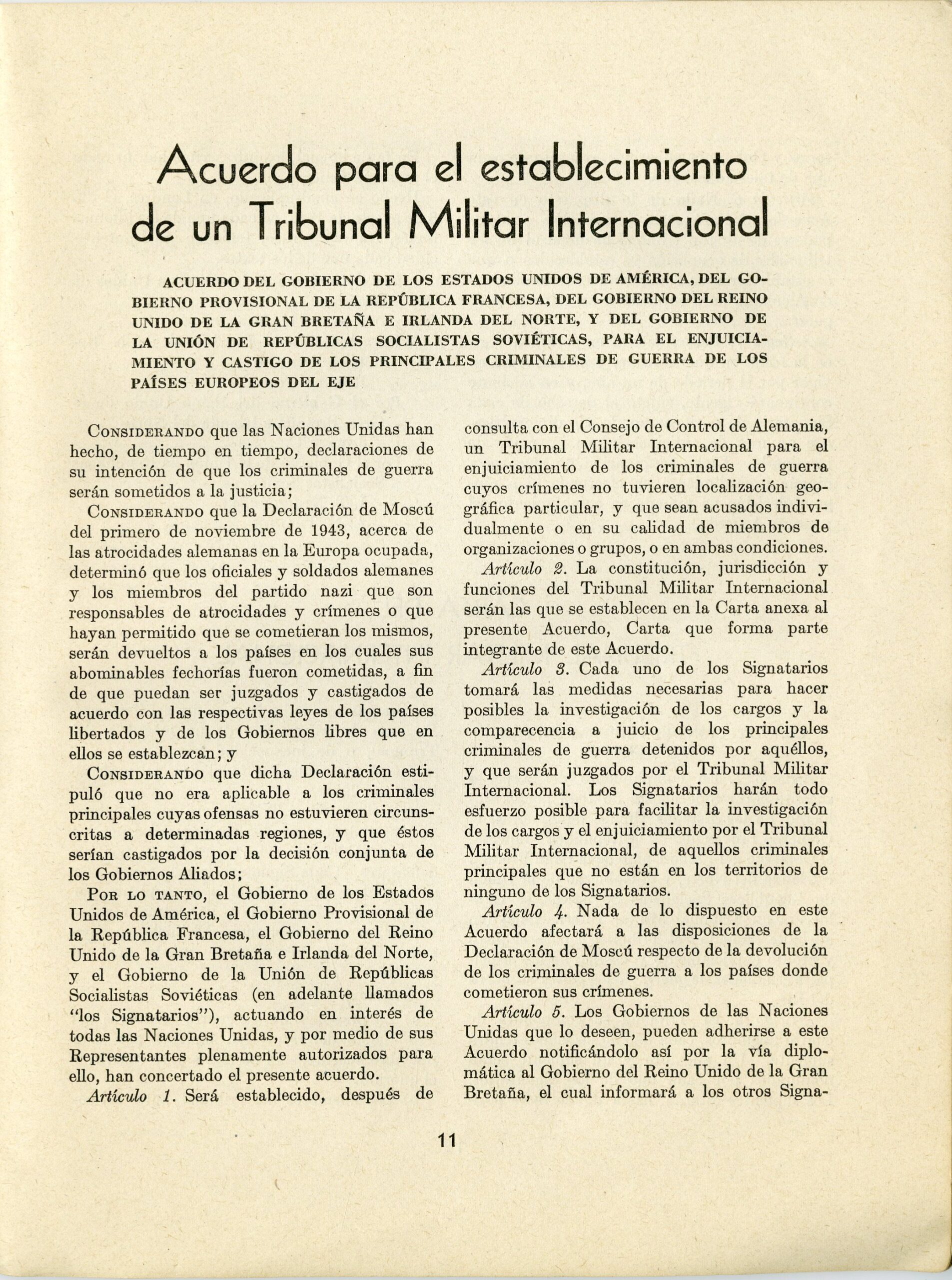 The second part: Agreement for the Establishment of an International Military Tribunal, detailing the agreement signed in London in August 1945 by the four Allied powers—the United States, Great Britain, France, and the Soviet Union—to establish the International Military Tribunal at Nuremberg. The agreement defined the jurisdiction of the tribunal and the categories of crimes under which individuals could be prosecuted: Crimes against peace: the planning, initiation, or waging of aggressive war in violation of international agreements. Crimes against humanity: murder, extermination, enslavement, deportation, and other inhumane acts committed against civilian populations. War crimes: serious violations of the laws of war, including mistreatment of prisoners of war and the killing of civilians. The agreement also set forth the composition of the tribunal, the scope of its powers, and the legal procedures that would govern the trials.