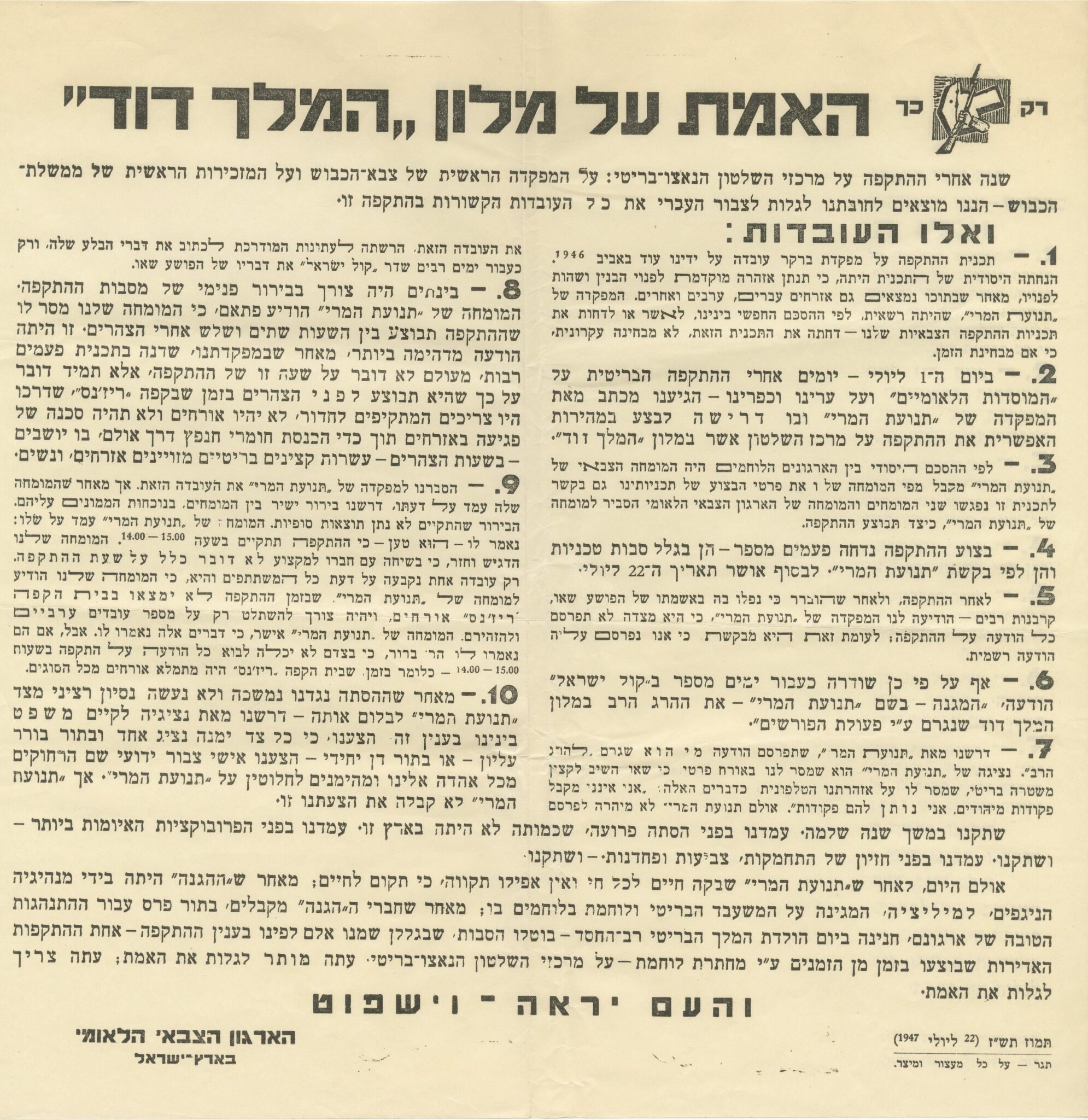 The organization, exactly one year after carrying out the bombing attack at the King David Hotel by its members, reveals various details regarding the planning and execution of the operation, and places the blame for the killing of innocent civilians on members of the “Jewish Resistance Movement.” The poster states that the plan was conceived as early as the spring of 1946, but was postponed for various reasons. The plan was to allow evacuation of the building by issuing an early warning in order to avoid harming the Jewish population present in the hotel. On July 1, the order to carry out the operation was received from the headquarters of the “Jewish Resistance Movement”, as a response to the British raid on the “National Institutions”. After further delays, mainly due to technical reasons, the date of the attack was set for July 22. Immediately following the attack, a dispute broke out between Irgun members and members of the Jewish Resistance Movement regarding the cause of the large number of casualties resulting from the operation, due to conflicting instructions about the exact timing of the attack on that day. In order to clarify the truth, Irgun representatives requested the appointment of an arbitrator to determine the facts between their claims and those of the Jewish Resistance Movement. However, the latter refused any discussion.