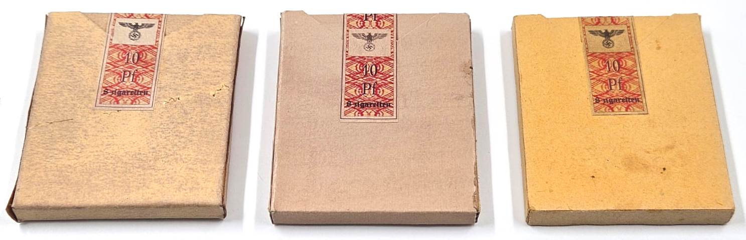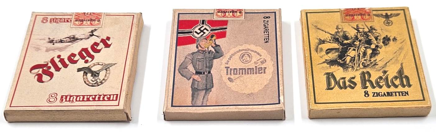 Three sealed cigarette boxes, never opened, bearing the emblems of various SS units and the Wehrmacht in Nazi Germany. Germany, 1930s.