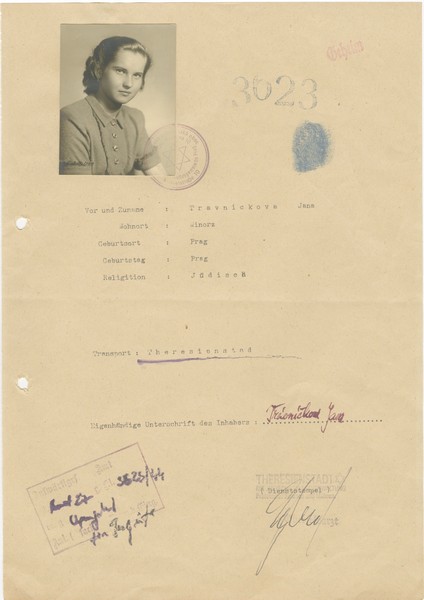 Registration certificate of Travnickova Jana, born in Prague, registration number: 3623. In addition to Jana’s passport photo, the document includes her blue fingerprint and handwritten signature: Travnickova Jana. Also features the secretary’s handwritten signature and Star of David stamps of the Jewish self-administration in the ghetto. Her name does not appear in Yad Vashem’s database nor in the Arolsen Archives. Her fate is unknown.