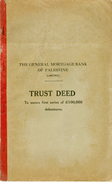 The trust deed was executed between the parties in connection with the bank’s first debenture series issuance in the amount of £100,000. The purpose of the deed was to secure the rights of the bondholders (debenture holders) and to outline the legal obligations between the bank and the trustees. At the time, the bank did not own any real estate (immovable property) that could be mortgaged under the laws of the Mandate in Palestine – only short-term leasehold rights.