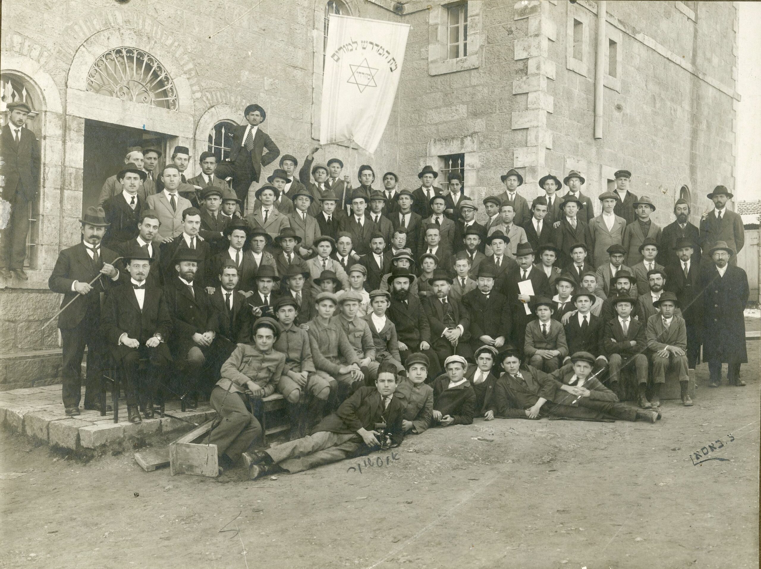 Large group photograph of the teachers and students of the “Beit Midrash Lemorim” (Teachers’ Seminary) of Mizrachi, taken at the entrance to the institution, Beit Kokia, located off Jaffa Road. Photographer: Tzadok Bassan (signed in the plate). Mounted on the photographer’s original cardboard backing. Jerusalem, 1920s.