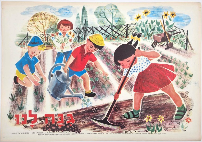 “Color Wall Pictures” – a folder containing 20 color posters on the theme “In the Field and in the Village”, published by Keren Kayemet LeIsrael (KKL – JNF) for kindergartens and elementary schools, housed in the original folder. Jerusalem, [1950s–60s].