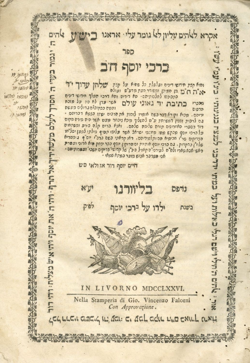 ברכי יוסף, חלק שני. חידושי דינים ופלפולים על שולחן ערוך יורה דעה, אבן העזר וחושן משפט. מאת רבינו חיים יוסף דוד אזולאי זיע"א. ליוורנו, תקל"ו [1776]. מהדורה ראשונה שהודפסה בחיי המחבר – הגהות.