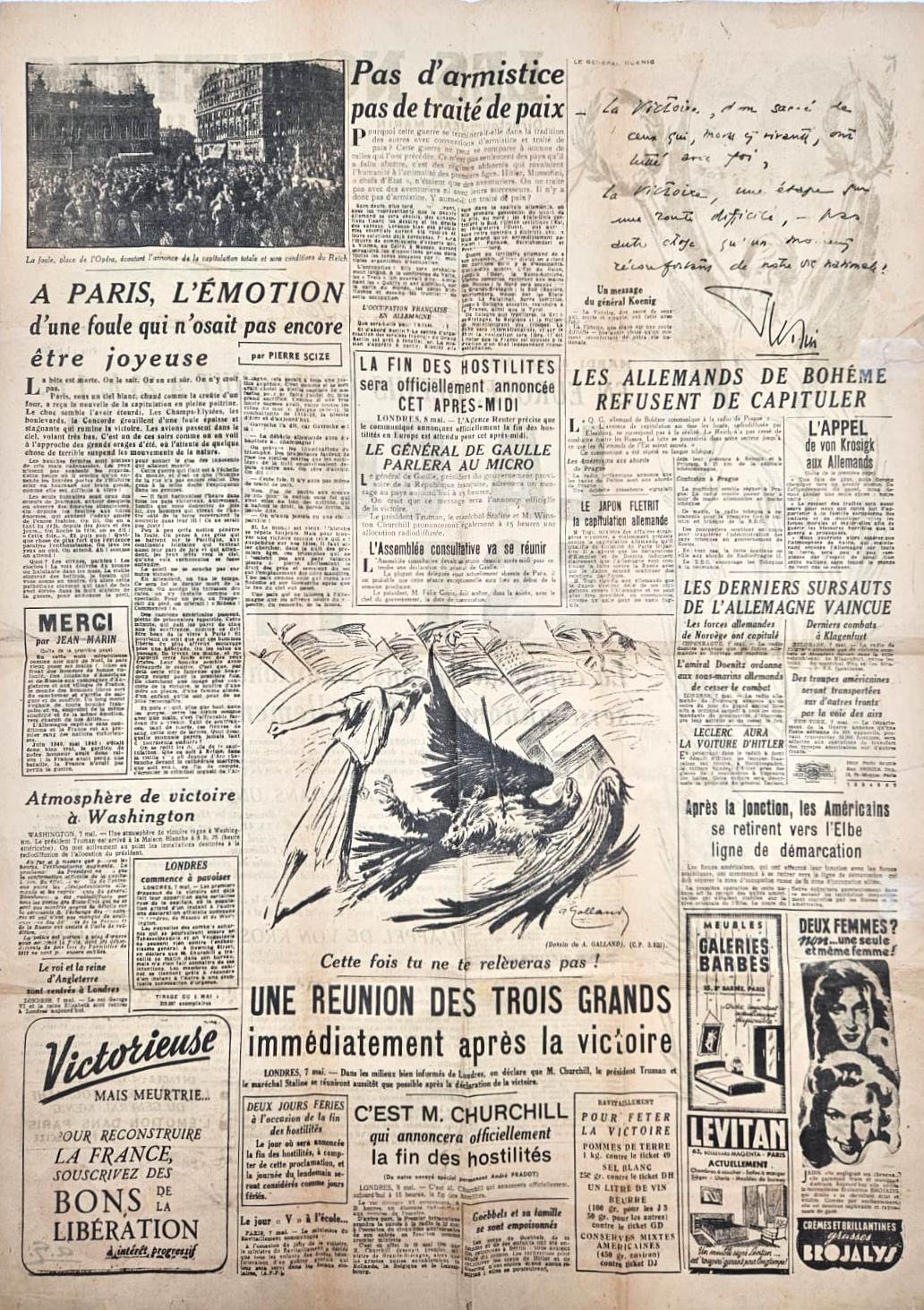 בגיליון, דיווח על הכניעה הגרמנית שנכנסה לתוקף בלילה שבין 7 ל 8 במאי בשעה 23:01: "הגרמנים נכנעו ללא תנאי… ראש המטה של הגנרל אייזנהאואר קיבל את כתב הכניעה עבור הפיקוד העליון של בעלות הברית…", וכן מאמר מרגש מאת עורך הגיליון Jean Marin הכותב: "סוף המלחמה. הכניעה ללא תנאי של הרייך השלישי! אנחנו בקושי מעזים להאמין. אנחנו כמעט מהססים להבין במלואה את משמעותן של מילים מרתקות אלה. ובכל זאת, במשך חודשים ושנים, מיליוני בני אדם נשאו במילים אלה את השפלתם, את כאבם, את תקוותם הנצחית". בעמוד השני תצלום של ההמון הנרגש באולם האופרה מאזין לכניעתה המוחלטת של גרמניה ללא תנאי, סיקור של פעולותיה האחרונות של גרמניה המובסת, "פגישת שלושת הגדולים מיד לאחר הניצחון", חלוקת מזון לרגל יום הניצחון, הודעת הגנרל קניג מכתב ידו "הנצחון מתנה קדושה…", וכן במרכז איור מרשים של חץ הננעץ בבטנו של הנשר הנאצי על רקע צלב הקרס, דגלי בעלות הברית, והכיתוב: "הפעם לא תקום", ועוד.