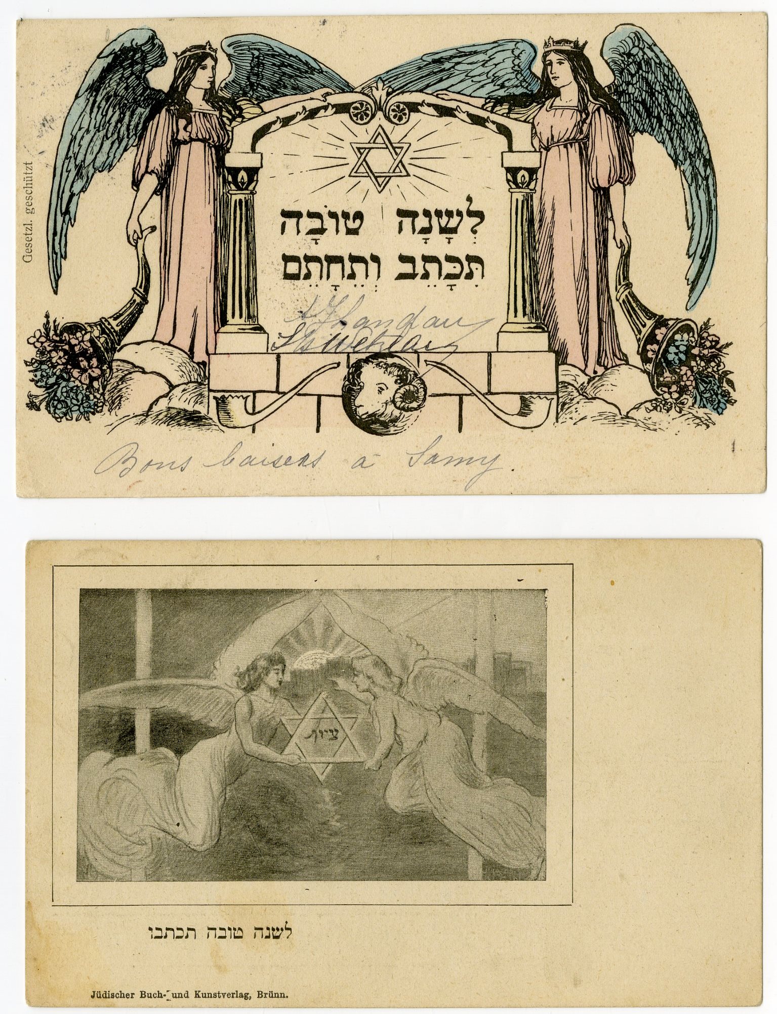 גלוית "שנה טובה" מאוירת מטעם "בית-היתומות הכללי" בירושלים (Allg. Isr. Mädchen-Waisenhaus in Jerusalem) שיצאה במיוחד לאחר קבלת יתומים למוסד מפליטי פוגרום שהתרחש ברוסיה, וחשש שישלחו למוסדות המיסיון הנוצרי בשל אי היכולת של המוסד לקבלם. גרמנית ומעט עברית. ראשית המאה ה־20. נשלחה בדואר ב 1908.