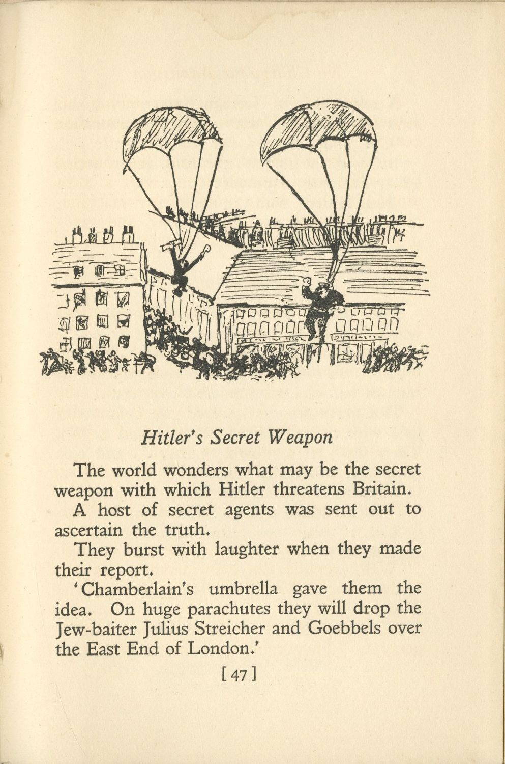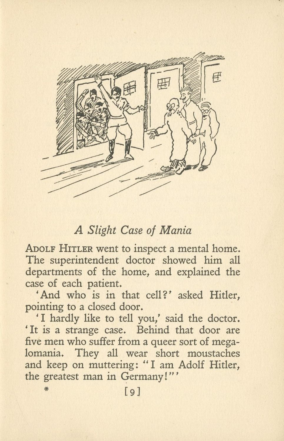 ספר בדיחות הלועגות להיטלר ולראשי המפלגה הנאצית. בהקדמה כותב העורך כי הוא רואה לנכון להביא למקום אחד את הבדיחות הנאמרות על היטלר במקומות שונים כדי להפיג את הפחד שמנסה להשליט המפלגה הנאצית בכל מקום. בספר שלל בדיחות אמיצות על תורת הגזע הנאצית, יחסם של הנאצים ליהודים, ראשי המשטר הנאצי, בדיחות לעג על המועל יד הנאצי, בדיחות על שריפת הרייכסטאג הגרמני, בדיחות הלועגות לשיטת התעמולה הנאצית אשר התאפיינה בחזרה על שקרים שוב ושוב, בדיחות הלועגות לגבלס שקולו היה בוקע באופן קבוע מהרדיו הגרמני, לעג לחוסר ההשכלה של הרמן גרינג, בדיחות על סמל צלב הקרס, בדיחות על הוגי הדעות הנאצים, על טקסי הרחוב של המפלגה הנאצית, על איך יראה יום מותו של היטלר, ועוד.