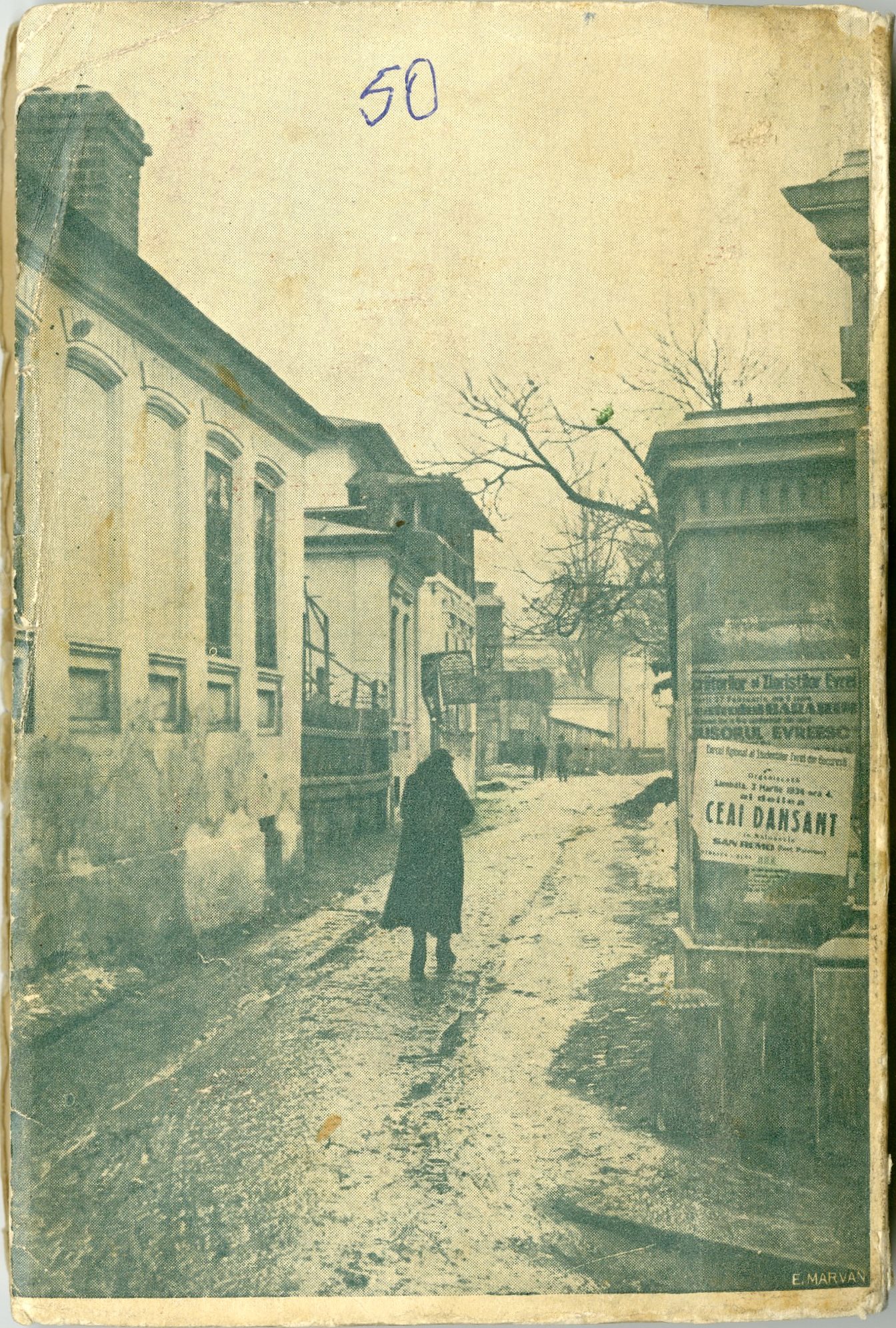 עיצוב מרשים של הכריכה: במרכז התמונה מופיעים חמישה גברים יהודים חרדים, לבושים במעילים ארוכים ומגבעות פרווה, וזקנים עבותים אופיינים ל"גטו" הרומני של אותן שנים. הבעות פניהם רציניות, צועדים בתהלוכה קודרת. ברקע ניגוד חריף: מבנים של עיר מודרנית ובורגנית, כנראה בוקרשט, עם בנייני קומות גבוהים בסגנון מערבי אירופי של שנות ה־30. העיר הסואנת עם ארכיטקטורה מודרנית עומדת בניגוד חריף לדמויות החזית, המייצגות את העולם היהודי המסורתי. בתחתית דמויות קטנות נוספות, אולי עוברי אורח או תושבי העיר – נבלעים בנוף העירוני, ויוצרים תחושת ניכור ומרחק בין היהודים המסורתיים לבין סביבתם העירונית.