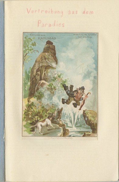 מהדורה לא ידועה של "הפרוטוקולים של זקני ציון" – אשר הופצה על ידי הכיבוש הגרמני בצרפת הכבושה. [מהדורה צרפתית, ראשית שנות ה־40]. בעמוד קדם המבוא הודבקה גלויה אנטישמית מוקדמת Gruss aus Karlsbad בה נראה יהודי מזרח אירופאי עם זקן ופיאות מושלך מצוק מתוארת בדפוס: HIRSCHENSPRUNG – "קפיצת האייל". מעליה נכתב בכתב יד בגרמנית: "Vertreibung aus dem Paradies" – הגירוש מגן עדן.