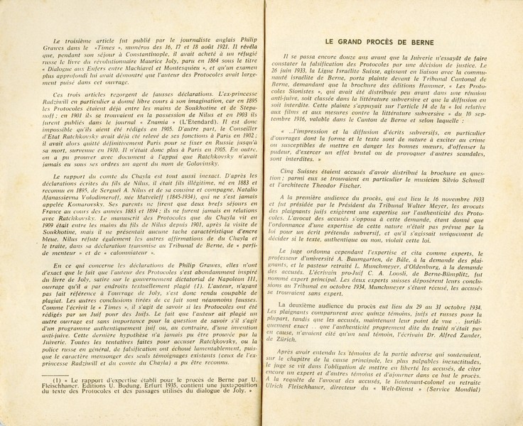 האתגר שעמד בפני האנטישמים בהוצאה של מהדורה זו היה המשפט שהתנהל בברן זמן קצר קודם לכן (במאי 1935) בו פסק בין המשפט שה"פרוטוקולים" מזויפים ואסר את הדפסתם בשוויץ. במבוא נכתב כי המשפט הוטה לטובת התביעה היהודית לאחר שהשופט סירב ללא כל סיבה לקבל עדות של ארבעים עדים שבאו להוכיח שהמסמך הינו אמיתי, וכי לכל אורך המשפט ניכר שהיו בו "שגיאות פרוצדורליות", וכך נכתב: "המשפט המרהיב בברן הסתיים אפוא בכישלון מוחלט של מטרות היהדות. הפרוטוקולים ישארו מסמך אשר, הודות לאותו משפט, יוכר כאותנטי עוד יותר משום שהיהדות, כדי להפריך אותנטיות זו, לא מצאה דבר טוב יותר מאשר להסית שופט לגזר פסק דין שגוי, תוך הסתמכות על סעיף חוק שאינו רלוונטי, הפרת הליכים ושימוש בנתונים לא מדויקים."