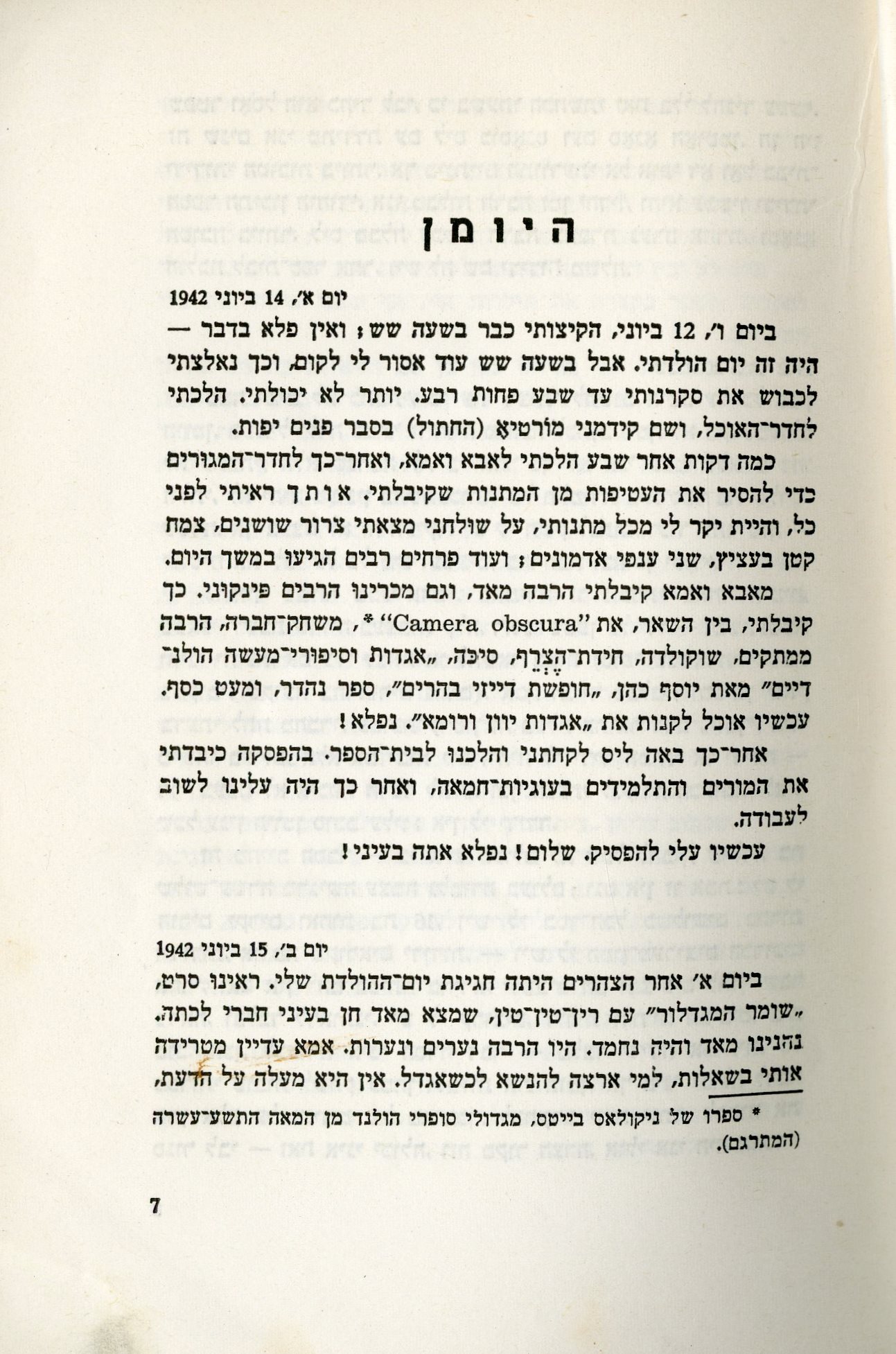 מהדורה ראשונה בעברית של 'יומנה של אנה פראנק' בתרגומו של ש. שניצר שיצאה לאור שש שנים אחרי המהדורה הראשונה שיצאה לאור בהולנד [בהולנדית] ב 1947. המהדורה העברית הראשונה שלפנינו, יצאה לאור במספר עותקים מוגבל וחולקה כמתנה למנויי עתון "דבר השבוע". תוך זמן קצר היומן קצר הצלחה רבה בקרב קהל הקוראים הישראלי והספר במהדורות רבות בארץ.