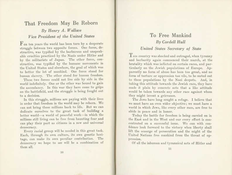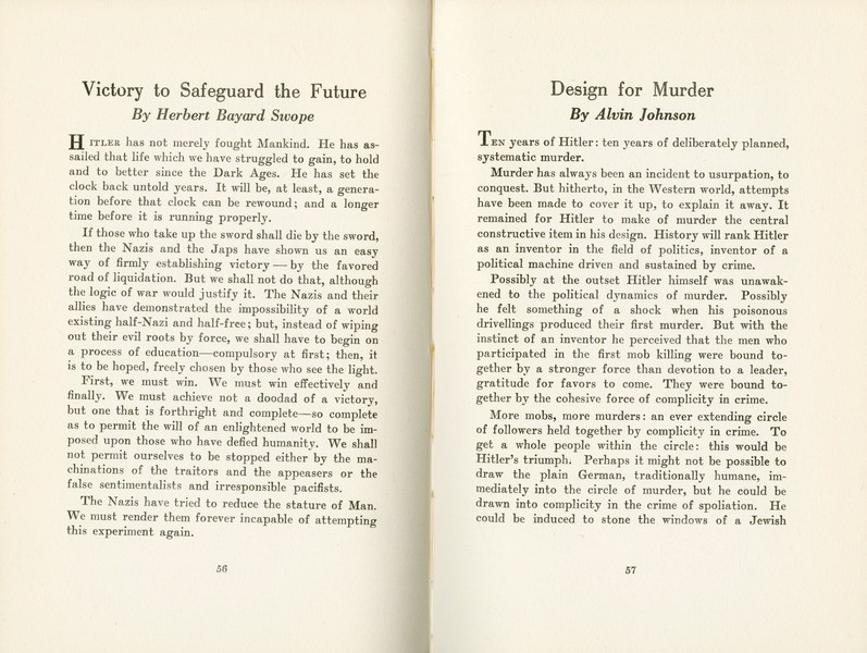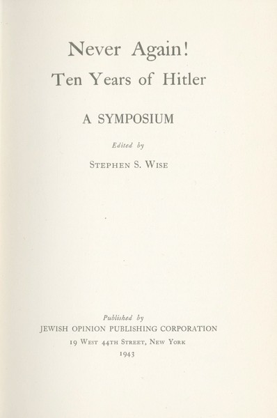 Never Again! Ten Years of Hitler – A Symposium – לעולם לא עוד! עשר שנות היטלר – סימפוזיון. בעריכת סטיבן סמואל וייז (Stephen S. Wise), הוצאת Jewish Opinion Publishing Corporation. ניו יורק, פברואר 1943 – מהדורה ראשונה.