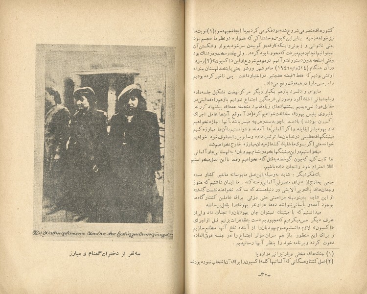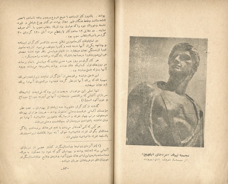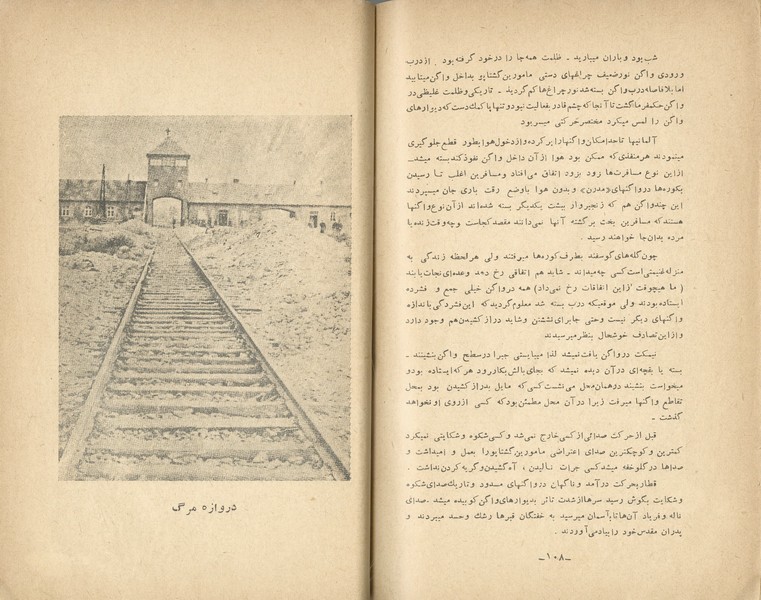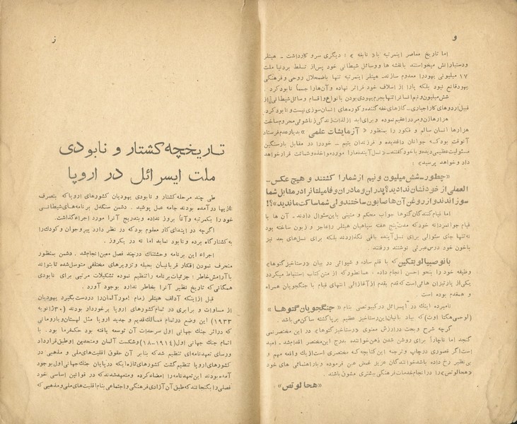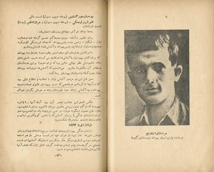 "מרד הגיטאות" – תיעוד חיי היהודים בגטאות בזמן מלחמת העולם השנייה ובפרט סיפור הגבורה של ההתנגדות היהודית במרד גטו ורשה (1943) – מלווה בתמונות של גיבורי המרד, ועוד. הוצאת הספר בטהרן בשפה הפרסית היתה חלק מיוזמה של הקמת הכשרה חקלאית לתנועת החלוץ בפרס, במסגרתה הוקמה ספריה ציונית שסבלה ממחסור חמור בספרים בשפה המדוברת – הפרסית. הקדמה ארוכה המתארת את עליית היטלר לשלטון, רדיפת היהודים ושילוחם למחנות המוות, וכן טבלה מפורטת המתארת את מספרם של הנספים מכל מדינה באירופה.