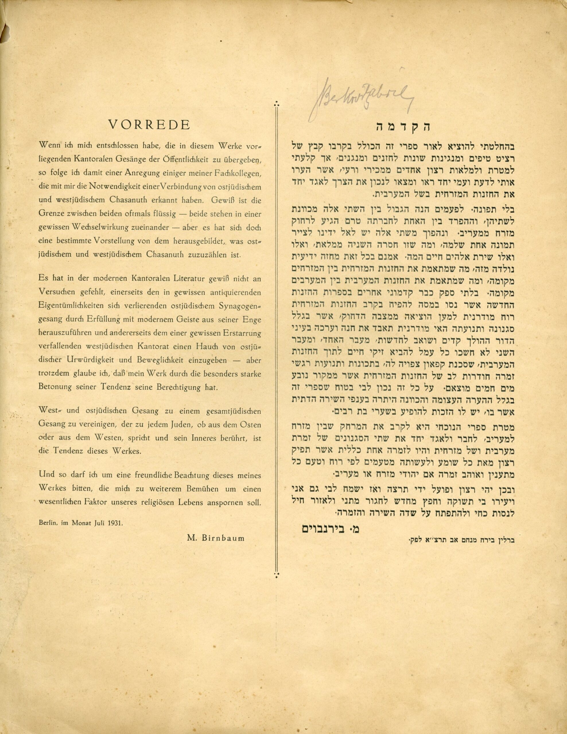 שירי זמרה – SCHIRE SIMROH REZITATIVE MIT UND OHNE BEGLEITUNG FOR DEN ISRAELITISCHEN GOTTESDIENST KOMPONIERT VON M. BIRNBAUM EHEM. OBERKANTOR IN HALBERSTADT UND WIESBADEN ERSTER TEIL: FREITAG ABEND UND SABBAT-MORGEN 0- "שירי זמירה – רצ'יטטיבים עם ובלי ליווי לתפילה הישראלית (היהודית), הולחנו על ידי מ. בירנבאום לשעבר החזן הראשי בהאלברשטדט ווויסבאדן חלק ראשון: ערב שבת ובוקר שבת". ברלין, 1931 – מהדורה ראשונה. נדיר.