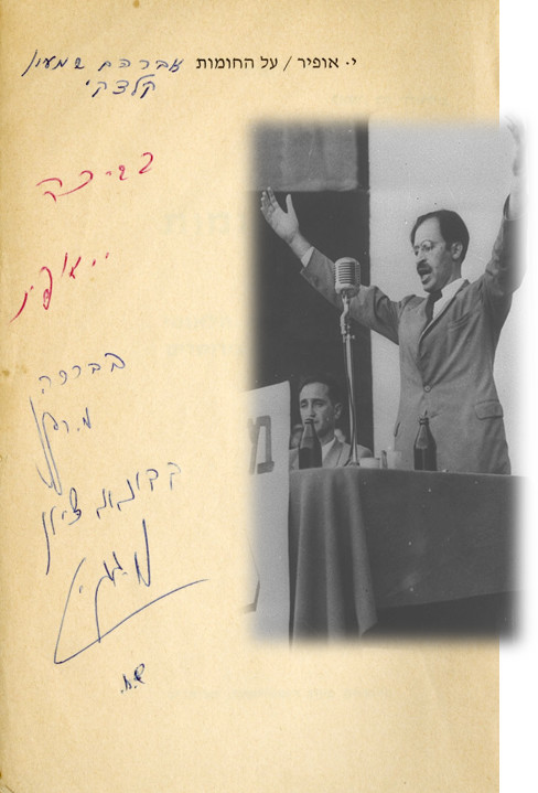 על החומות' הארגון הצבאי הלאומי במערכות תש"ח בירושלים', תל אביב 1961. בדף המגן הקדשה בכתב ידו וחתימתו של ראש ממשלת ישראל מנחם בגין וכן הקדשה בכתב ידו וחתימתו של המחבר יהושע אופיר. עותק שניתן במתנה לאברהם שמעון קלצקי.