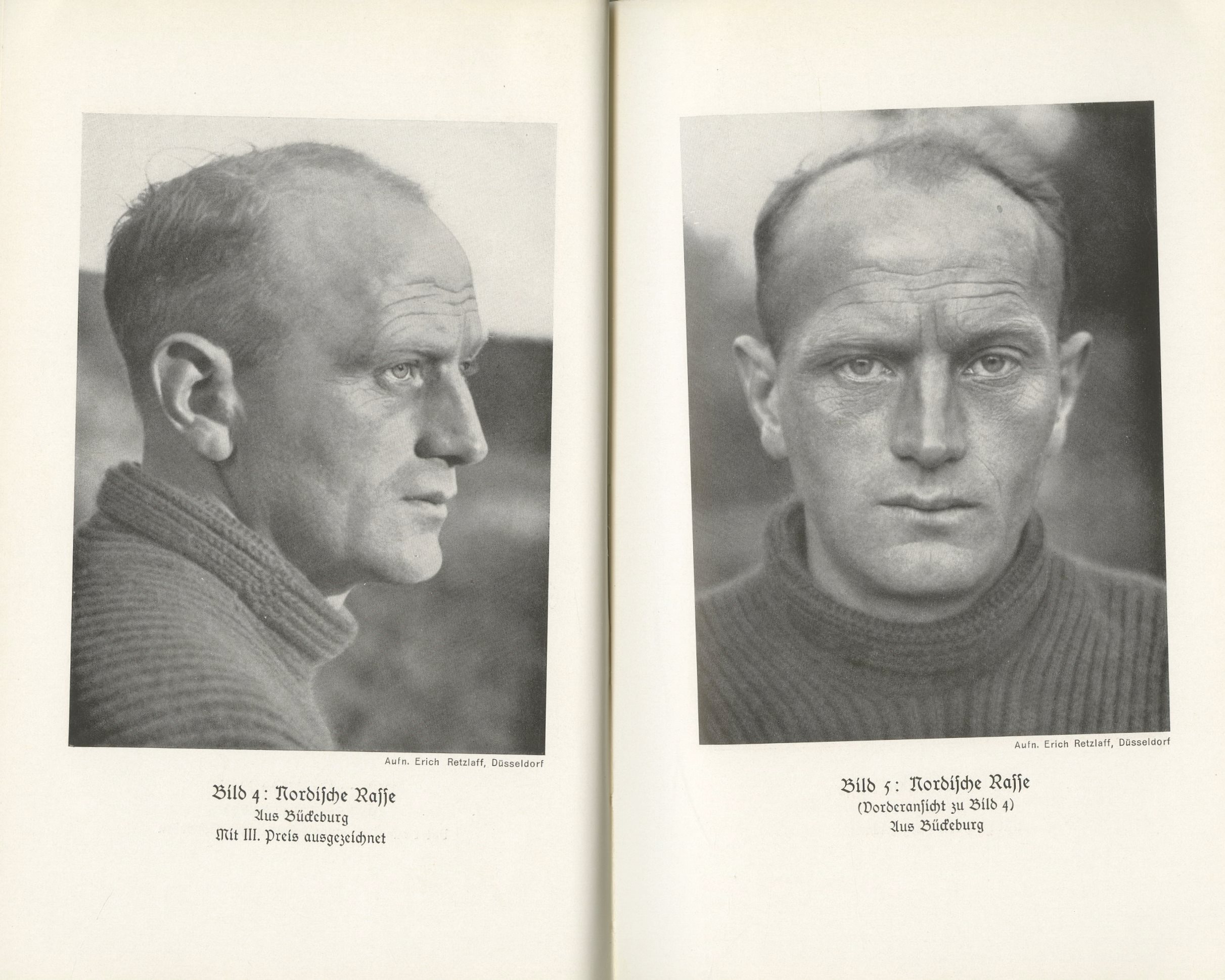 Deutsche Rassenköpfe – 43 preisgekrönte Bilder aus einem Wettbewerb Von Dr. B. K. Schultz J. F. Lehmanns Verlag München – "פרצופים גזעיים גרמניים" – 43 תצלומים זוכי פרס מתוך תחרות טוהר הגזע, מאת ד"ר ברונו ק. שולץ הוצאת י.פ. להמן, מינכן. עותק מושלם עם מעטפת הנייר המקורית. ניסיון המחשה של העקרונות העומדים בבסיסה של התיאוריה ההרסנית ביותר בתולדות האנושות. נדיר.
