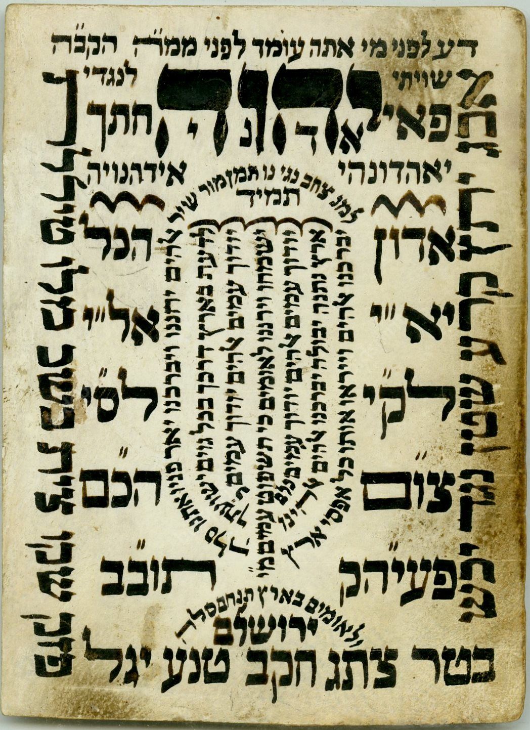 לוח 'שויתי' עם מנורת 'למנצח' מוקדמת עם שמות הווי-"ה וצירופי שמות מלאכים. ירושלם, המאה ה-19. נדיר. גודל: 14×10 ס"מ. מסגרת עץ וזכוכית: 21×23 ס"מ. כתמים מצב טוב.