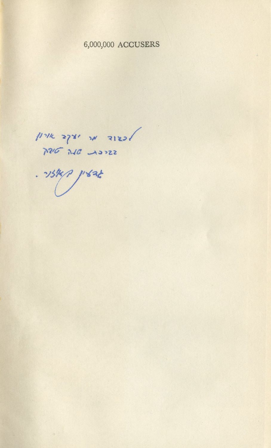 6,000,000 Accusers, Israel's Case against Eichmann [שישה מיליון קטגורים, מדינת ישראל נגד אדולף אייכמן], נאום הפתיחה של היועץ המשפטי לממשלה, גדעון האוזנר, במשפט אייכמן. תרגום לאנגלית מאת שבתאי רוזן. הוצאת Jerusalem Post, ירושלים, 1961. אנגלית. עותק עם הקדשה חתומה בידי גדעון האוזנר: "לכבוד יעקב אורון בברכת שנה טובה גדעון האוזנר".