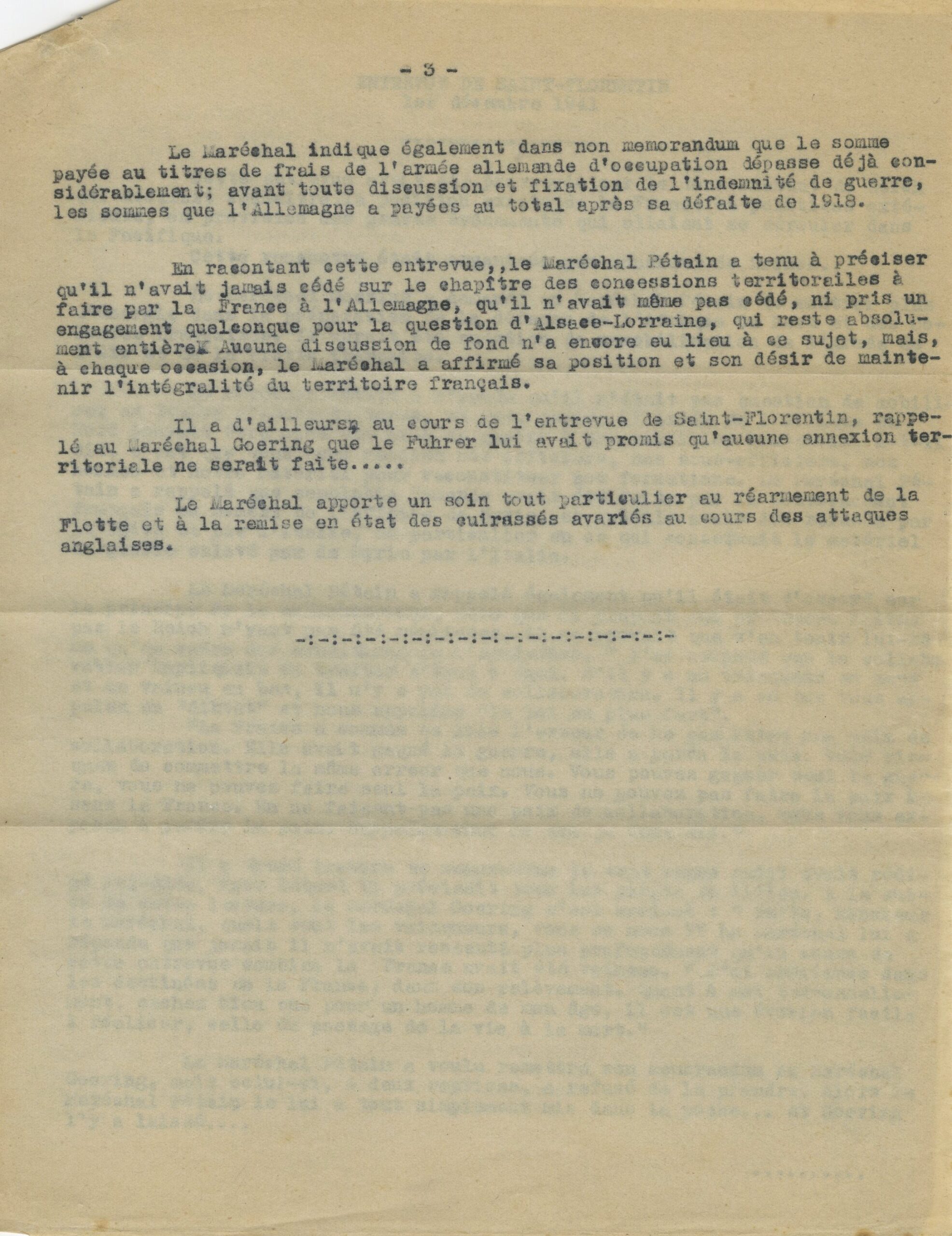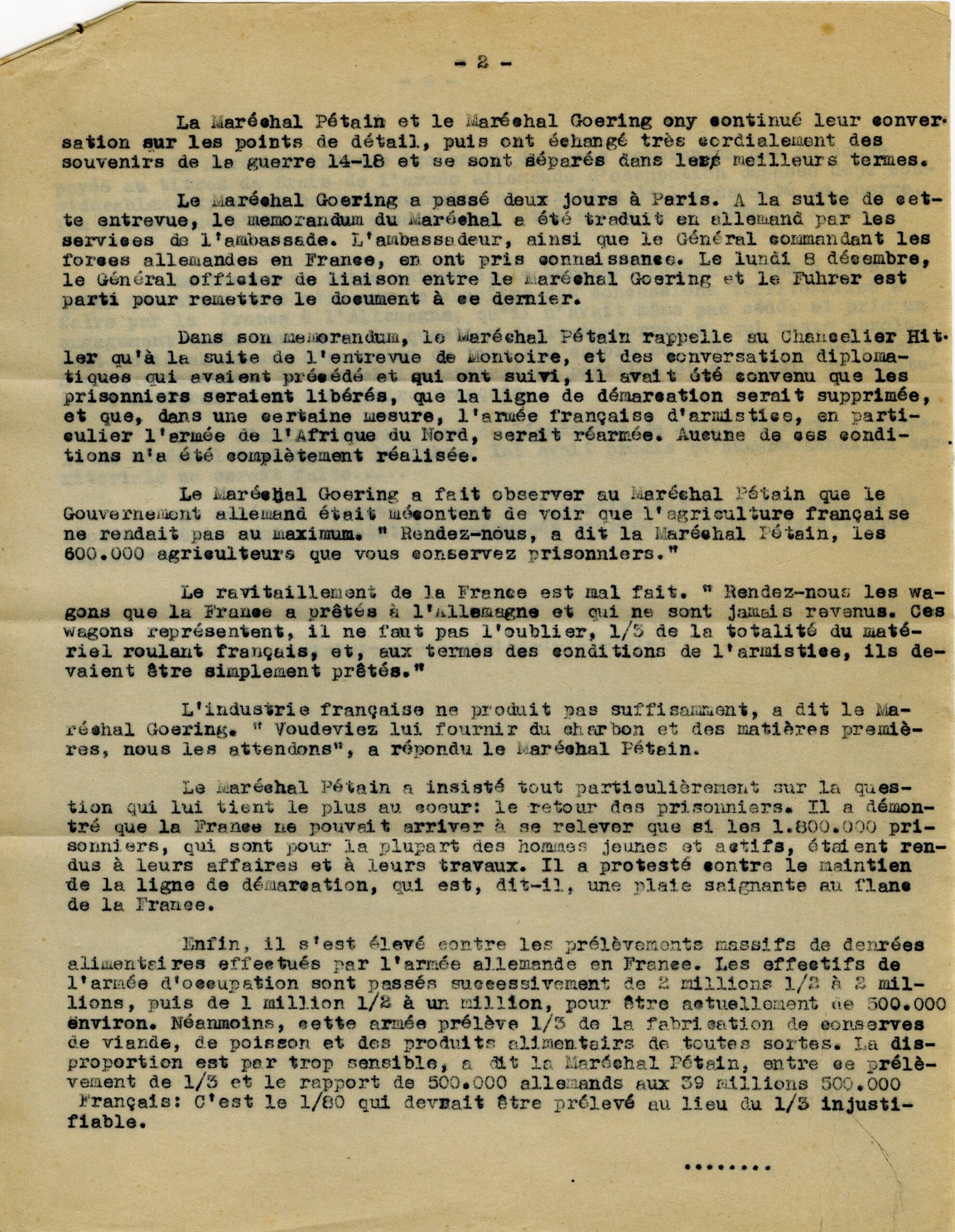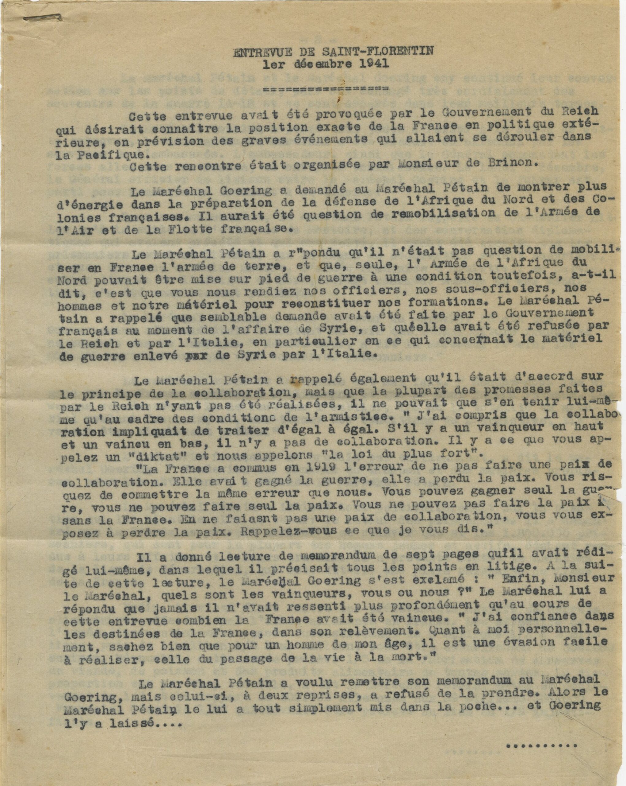 תיאור מפורט של פגישת מפקד הלופטוואפה ומשרד התעופה הגרמני הרמן גרינג עם ראש ממשלת צרפת של וישי אשר שיתפה פעולה עם גרמניה הנאצית פיליפ פטן בסן-פלורנטין, שהתקיימה ב-1 בדצמבר 1941 – כיצד ניסה פטן הכנוע להציג את צרפת מול גרמניה הנאצית כבת ברית שווה, והניסיון של גרינג לגייס את פטן כבן ברית כנוע למאמצי המלחמה של גרמניה. הדפסה במכונת כתיבה מזמן ההתרחשות על פי עוזרו של פטן שהיה נוכח בפגישה. נדיר.