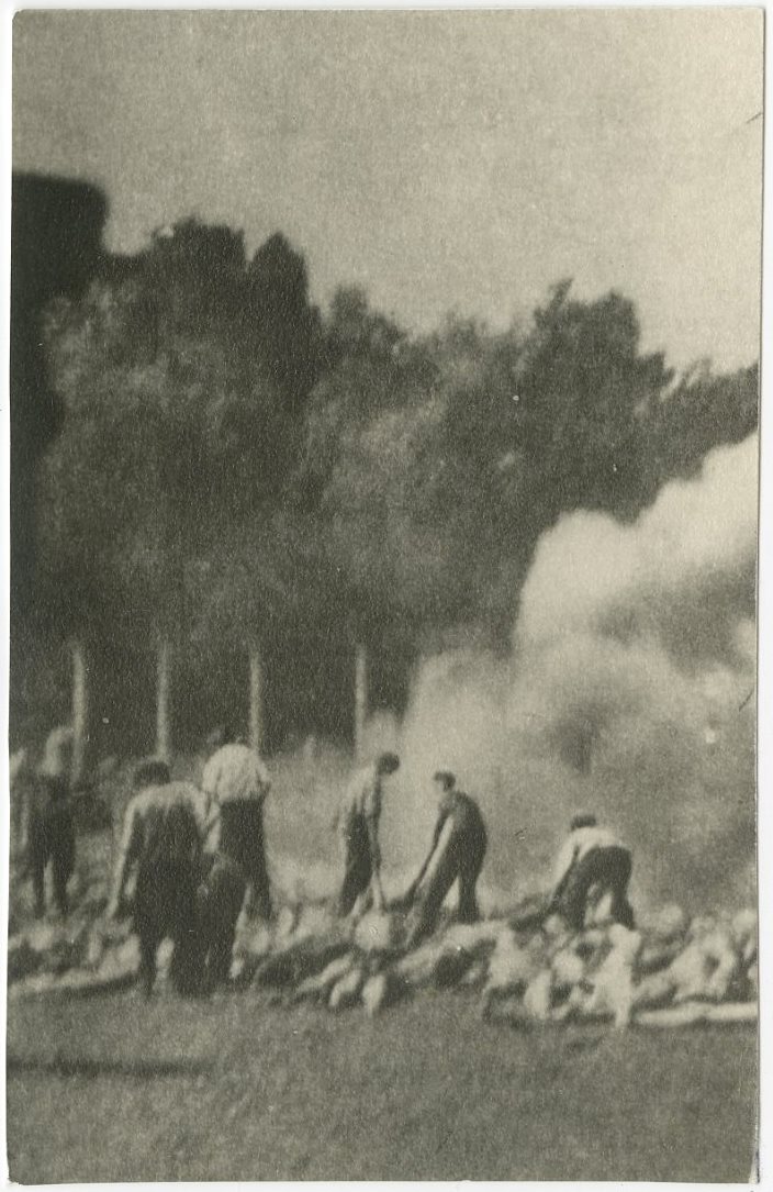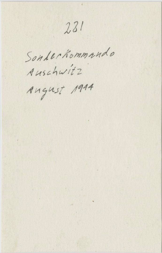 תצלום מחריד של יחידת הזונדרקומנדו מובילים גופות לשריפה באושוויץ – אחד מארבעת התצלומים המטושטשים שצולמו בחשאי באוגוסט 1944 בתוך מחנה הריכוז אושוויץ על ידי אסיר המחנה היהודי אלכס (אלברטו ישראל אררה), והוא התיעוד המצולם היחידי בסביבת תאי הגזים בו ניתן להבחין בסוף תהליך ההשמדה במחנה. ממוספר ומתואר מאחור: "Sonderkommando Auschwitz August 1944", המספר 281 זהה למספר התצלום המקורי שבמוזאון אושוויץ, כפי הנראה לפנינו אחד הפיתוחים המוקדמים מהתשליל המקורי שנעשה לצרכי מחקר.